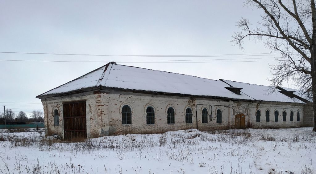 1. Местоположение и градостроительные характеристики Усадьба Афанасьевых расположена в центре села. В её северо-западной части расположено здание главного корпуса конезавода, главным фасадом ориентировано на восток Этажность и высотные габариты здания: одноэтажное Объёмно-пространственная структура здания (в редакции кон. XIX в.): прямоугольное в плане здание под вальмовой крышей 2. Инженерно-конструктивные характеристикиКрыша: форма – вальмовая Стены: материал – красный кирпич на известково-песчаном кладочном растворе;пространственно-планировочная структура интерьеров – капитальные стеныКолонны – квадратного сечения Перекрытия – железобетонные, кессонные Окна:форма проёмов – арочные (полуциркульные);столярные заполнения: материал – дерево; характер оформления – расстекловка и профилировка Двери:форма проёмов – лучковые;столярные заполнения: материал – дерево;характер оформления – филёнчатые (не сохранились) 3. Стилистика: эклектика4. Композиция и архитектурно-художественное оформление фасадовПрофилированный карниз, отмеченный на фризе полоской сухариковСандрики в виде архивольтов Пилястры Рельефный веерный сандрик Плоские наличники с подоконными профилированными полочками