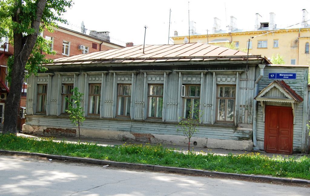 1. Градостроительные характеристики1.1. Место расположения здания в современных границах участка: расположено в центральной части города в ряду малоэтажной исторической и современной застройки, одноэтажным объёмом выходит на красную линию ул. Александра Матросова (бывший Жарковский переулок), главным фасадом ориентировано на восток (фото 1 - 5).1.2. Этажность и высотные габариты здания: одно- и двухэтажное (фото 1-5).1.3. Объёмно-пространственная структура здания (в редакции начала XX в.): Г-образное в плане, состоит из одноэтажного деревянного объёма под вальмовой крышей, к которому с северной стороны примыкает одноэтажный объём тамбура входа под односкатной крышей, а с восточной – двухэтажный объём под вальмовой крышей, дополненный с северной стороны двухэтажным пристроем под односкатной крышей и небольшим одноэтажным тамбуром входа под односкатной крышей (фото 1-5).2. Инженерно-конструктивные характеристики2.1. Материал (дерево) и способ рубки (в обло) стен.2.2. Форма крыши: сложноскатная, вальмовая (фото 2, 3, 5).2.3. Материал кровельного покрытия (гладкие металлические листы с фальцевыми соединениями) (фото 3, 5).2.4. Форма перекрытий: плоские.2.5. Форма оконных и дверных проёмов: прямоугольная (фото 1-7).2.6. Заполнения оконных и дверных проёмов в редакции начала XX в.: со стороны восточного и южного фасадов – первоначальный материал (дерево) и форма (расстекловка и профилировка) заполнений, со стороны дворовых фасадов – первоначальная форма (расстекловка) (фото 2, 3, 7).3. Архитектурные характеристики3.1. Стилистика: модерн (фото 1-3).3.2. Композиция и архитектурно-художественное оформление фасадов (в редакции начала XX в.): дощатая обшивка: на главном фасаде – вертикальная, в области подоконья – горизонтальная, на остальных фасадах – горизонтальная (фото 1-5); деревянные резные кронштейны (фото 1, 9);навесной декор козырька и причелин в виде фестонов (фото 9);наличники в виде профилированных криволинейных сандриков, опирающихся на кронштейны, проходящие по всей высоте окна, выполненные в виде узких резных колонок (фото 1, 3, 7, 8);наличники рамочные профилированные (фото 4-6); накладной геометрический декор в форме квадратов (фото 1-3, 6-8);подоконный профилированный поясок (фото 1-3, 7, 8);профилированные сандрики-полочки (фото 4-6).