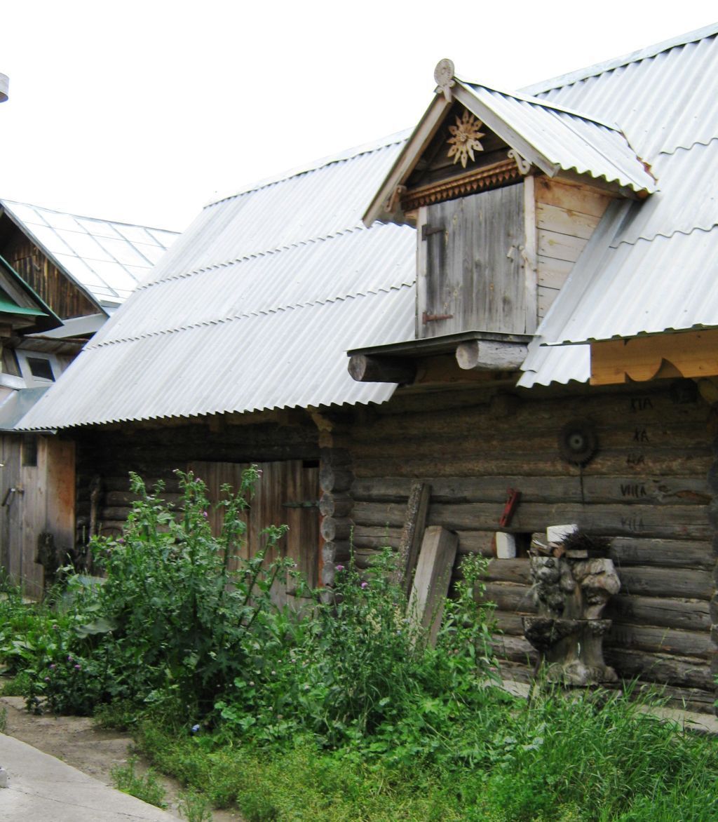 Градостроительные характеристики:место расположения здания в современных границах участка: в центре села на улице Льва Толстого (бывшая Заречная), напротив деревянной церкви во имя Богоявления Господня, вдоль северо-восточной границы дворового пространства. Надворные постройки расположены в южной части участка, главным фасадом выходят на улицу Л. Толстого (фото 1-7);этажность и высотные габариты здания: одноэтажное (фото 1-7);объёмно-пространственная структура здания (в редакции второй половины XX в.): протяжённый прямоугольный в плане трёхчастный объём (погребица (лит. Г8), конюшня (лит. Г7), хлев (лит. Г6)) под единой двухскатной крышей. Со стороны правой трети строения к основному объёму здания пристроен односкатный навес на столбах кронштейнах (лит. Г5), далее перпендикулярно к большому хозстроению примыкает малое хозстроение (литер ГЗ) главным фасадом ориентировано на юго-запад. Рядом расположен прямоугольный объём амбара (литер Г2). Литеры Г3 и Г2 перекрыты единой односкатной крышей на кронштейнах, с большим выносом в сторону дворового пространства (фото 1-7).Инженерно-конструктивные характеристики:материал (дерево) и способ рубки (в обло) стен лит. Г3, Г2, Г6, Г7, Г8 (фото 1-8);материал (дерево) и форма (плоские) перекрытий;форма оконных и дверных проёмов - прямоугольные (фото 1-4, 6-8);заполнения оконных и дверных проёмов: первоначальный материал (дерево) и форма (расстекловка и профилировка) заполнений, в редакции середины XX в. (фото 2-4, 6, 8);материал кровельного покрытия - гладкие металлические листы с фальцевыми соединениями (фото 1-7). Архитектурные характеристики:-стилистика: народный стиль (фото 1-8);-композиция и архитектурно-художественное оформление фасадов (в редакции второй половины XX в.), в т.ч.: резной декор слухового окна и свеса крыши лит. Г6 (фото 1-3, 7, 9); сандрики дверного и оконного проёмов, сочетающие рельефную, объёмную и краевую резьбу лит. Г2 (фото 8); дверные ручки авторской работы А.А. Пластова (фото 4, 10).