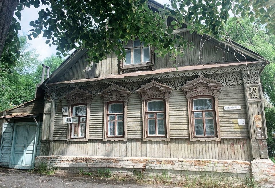 1.Местоположение и градостроительные характеристикиМесто расположения здания в современных границах участка: расположено в исторической части г. Ульяновска на улице Красноармейской (бывшая улица Старая Казанская), вместе с домом № 72 входит в состав усадьбы А.И.Сапожникова. Главным фасадом ориентировано на запад Этажность и высотные габариты здания: одноэтажное с мансардойОбъёмно-пространственная структура здания (в редакции начала XX в.): прямоугольный в плане дом состоит из первоначального прямоугольного с мансардой (светёлкой) под двухскатной крышей объёма, дополненного со стороны северного (дворового) фасада одноэтажным дощатым объёмом веранды и двухэтажным тамбуром входа под односкатными крышами. Крупномасштабный фронтон крыши объединяет мансардный и первый этажи дома2. Инженерно-конструктивные характеристикиФорма крыши (двухскатная и односкактная) и материал кровельного покрытия (гладкие металлические листы с фальцевыми соединениями) Материал капитальных стен (бревенчатые, рубленные «в обло») и пространственно-планировочная структура интерьеров (капитальные стены) Форма (прямоугольные и с лучковой перемычкой) и характер оформления (расстекловка и профилировка) столярных заполнений дверных и оконных проёмов 3. Композиция и архитектурно-художественное оформление фасадов 3.1. Стилистика: русский стиль. 3.2. Композиция и архитектурно-художественное оформление фасадов (в редакции начала XX в.): Дощатая обшивка фасадов, вертикально и горизонтально направленная; навесной декор фронтона из брусьев, завершающийся резным деревянным шпилем; профилированный карниз здания с подзором из пропильной резьбы; фризовый пояс из накладной пропильной резьбы; пилястры (выпуски сруба, обшитые доской) с декором из профилированных реек, имитирующим филёнки, и накладной пропильной резьбой в верхней части Причелины с краевой резьбой и подзор из пропильной резьбы слухового окна Наличники: с ушками, резными выпусками, фартуком пропильной резьбы и накладным декором в виде растительного орнамента, завершающиеся прямоугольным профилированным сандриком с пропильной и краевой резьбой; рамочные с фартуком с краевой резьбой, завершающиеся двухскатными профилированными сандриками с разорванным фронтоном и богато декорированным фризом (на южном фасаде – с филёнчатыми ставнями)