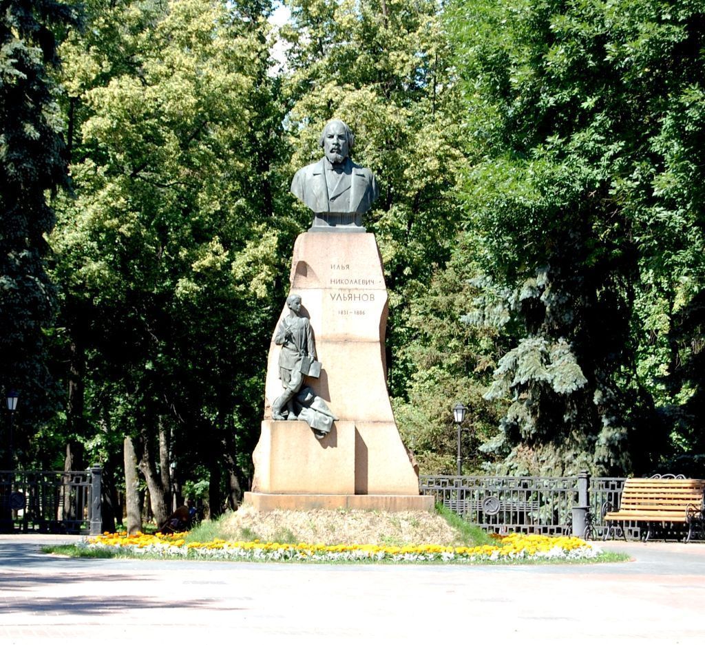 -место расположения в современных границах участка;-бронзовый бюст И.Н.Ульянова;-бронзовая статуя мальчика в натуральную величину; -высокий двухступенчатый постамент, верхняя часть выполнена из четырёх, поставленных друг на друга блоков красного гранита. Передняя грань шлифованная, остальные - с колотой структурой. На передней грани выбита надпись «ИЛЬЯ НИКОЛАЕВИЧ УЛЬЯНОВ 1831-1886»;-чугунная ограда сквера
