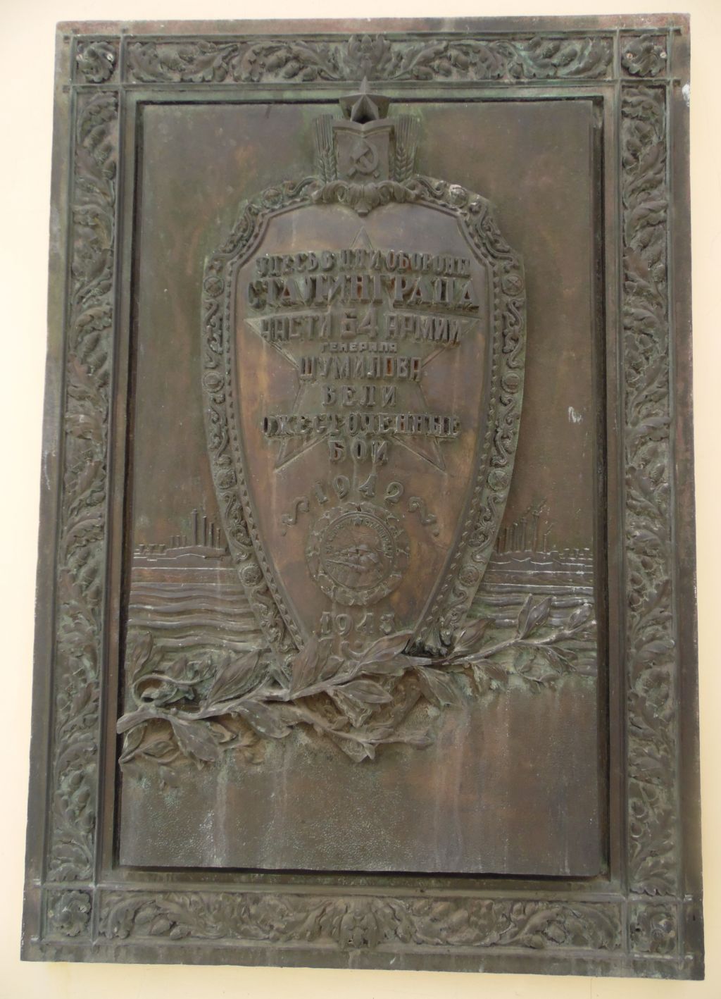 Особенностями, послужившими основаниями для включения в единый государственный реестр объектов культурного наследия (памятников истории и культуры) народов Российской Федерации и подлежащими обязательному сохранению (предметом охраны), объекта культурного наследия регионального значения \"Место, где в период Сталинградской обороны части 64 армии генерала Шумилова вели ожесточенные бои с немецко-фашистскими оккупантами\", 1942 - 1943 гг., расположенного по адресу: г. Волгоград, Советский район, пос. Купоросный, кожевенный завод, являются:территория объекта культурного наследия, утвержденная в установленном порядке;мемориальная доска, обозначающая место, где в период Сталинградской обороны (1942 - 1943 гг.) части 64 армии генерала Шумилова вели ожесточенные бои с немецко-фашистскими оккупантами, изготовленная в 1955 г. Мытищинским заводом художественного литья по проекту художника Художественного фонда СССР Ф. Андреева:- ее местоположение на главных проходных кожевенного завода в пос. Купоросный (объект культурного наследия регионального значения \"Кожевенный завод Смирнова (Волгоградский кожзавод)\", 1910 г., расположенный по адресу: г. Волгоград, Советский район, пос. Купоросный);- прямоугольная форма и размеры;- художественная композиция: в виде геральдической картины, полотно которой выступает из плоского багета, в составе:багет (рама), декорированный волнообразно изогнутыми листьями дуба с желудями, в углах которого в квадратных рамках заключены накладные элементы в виде многолепестковой круглой розетки с умбоном;задний план полотна: панорама корпусов заводов, дымящихся труб и других промышленных объектов, расположенных у реки, символизирующая г. Сталинград и Волгу;передний план: объемный, миндалевидной (каплевидной) формы щит древнерусского (варяжского) типа с противоположными дугообразными выемками в верхней широкой части; двухрядная рельефная окантовка щита: внешний широкий ряд в виде симметричных славянского типа \"г\"-образных растительных завитков с перехватом, чередующихся с круглыми медальонами, имеющими окантовку из перекрученного жгута и изображений эмблем родов войск: \"танк\", \"перекрещенные пушки\", \"перекрещенные винтовки\", \"крылья с пропеллером\", внутренний узкий ряд окантовки щита в виде волны; рельефная композиция, наложенная на верхнюю часть щита: пятиконечная звезда над зубчатым завершением крепостной стены типа \"ласточкин хвост\", обрамленного по сторонам пшеничным колосом и дубовым листом внизу, на фоне зубчатого завершения стены изображение серпа и молота; рельефный контур пятиконечной звезды по центральной части поля щита, на фоне которого рельефными буквами разной высоты нанесен текст \"ЗДЕСЬ В ДНИ ОБОРОНЫ СТАЛИНГРАДА ЧАСТИ 64 АРМИИ ГЕНЕРАЛА ШУМИЛОВА ВЕЛИ ОЖЕСТОЧЕННЫЕ БОИ\"; ниже надписи рельефное изображение медали \"За оборону Сталинграда\", обрамленной круглым дубовым венком, перевитым лентой; выше медали по дуге рельефное число \"1942\", относительно которого находятся симметричные славянского типа \"г\"-образные растительные завитки и точки; ниже медали рельефное число \"1943\"; рельефная лавровая ветвь, наложенная на нижнюю часть щита;- материал и техника изготовления доски - бронза, литье;- сектора и направления видовых раскрытий мемориальной доски.