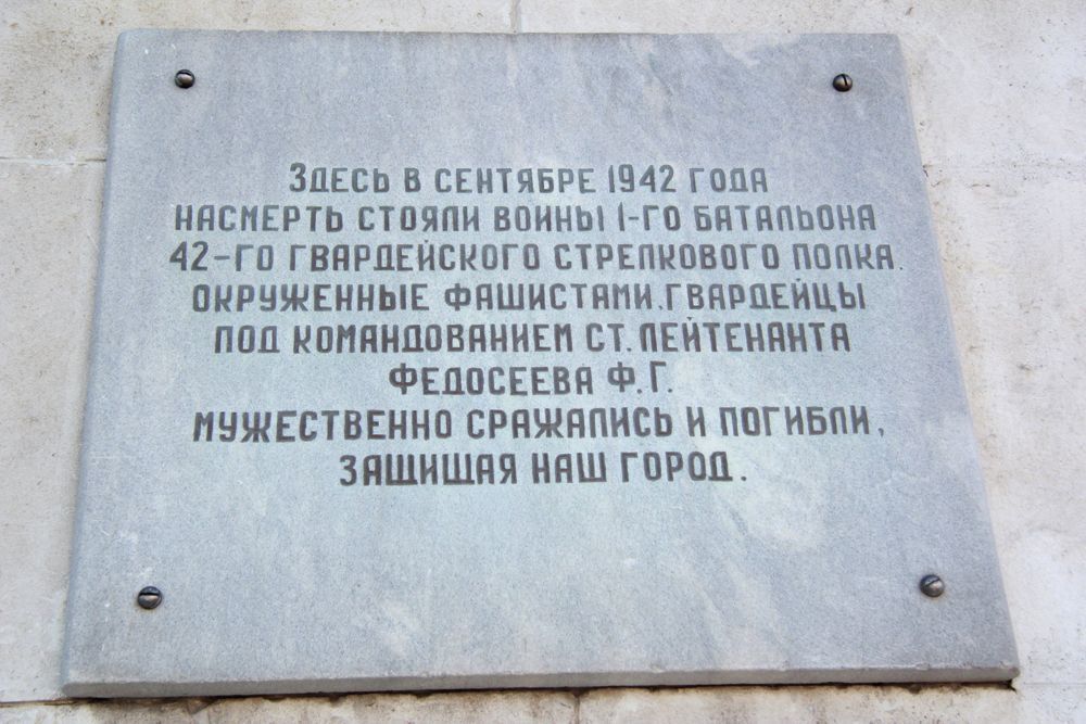 Особенностями, послужившими основаниями для включения в единый государственный реестр объектов культурного наследия (памятников истории и культуры) народов Российской Федерации и подлежащими обязательному сохранению (предмет охраны), объекта культурного наследия регионального значения \"Место, где сражались и погибли в окружении воины 1-го батальона 42-го гвардейского стрелкового полка 13-й Гвардейской стрелковой дивизии под командованием ст. лейтенанта Федосеева Ф.Г.\", 1942 г., расположенного по адресу: г. Волгоград, Центральный район, вокзал ж.д. ст. Волгоград-1, являются:территория объекта культурного наследия;мемориальная доска, обозначающая объект культурного наследия:- ее местоположение на фасаде здания вокзала,- конфигурация и размеры,- материал для изготовления доски (природный камень),КонсультантПлюс: примечание.Содержание абзаца соответствует официальному тексту документа.- текст мемориальной надписи: \"Здесь в сентябре 1942 года насмерть стояли воины 1-го батальона 42-го гвардейского стрелкового полка окру командованием ст. лейтенанта Федосеева Ф.Г. мужественно сражались и погибли, защищая наш город.\";секторы и направления видовых раскрытий мемориальной доски.