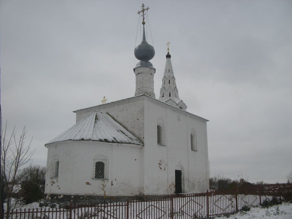 Предмет охраны памятника включает в себя следующие характеристики:Стилистическая характеристика: памятник представляет собой образец культовой постройки начала XVIII в., выполненный в древнерусском стиле с элементами барокко (поздние главки на барабанах и на шатре), характерном для суздальских посадских церквей XVII - XVIII вв.Градостроительные характеристики:- местоположение: памятник расположен в юго-восточной части города Суздаля, на левом берегу р. Каменка, на возвышении. Здание церкви удалено от линии застройки основной городской магистрали (ул. Ленина) и от линии застройки по ул. Красная горка. Возвышение, на котором стоит памятник, окружено с двух сторон береговыми откосами р. Каменка и р. Гремячки;- композиционная значимость (роль) в структуре окружающего ландшафта: высотная доминанта, являющаяся акцентом панорамного пейзажного раскрытия, ул. Красная горка, реки Каменка и окружающей застройки;- габариты, силуэт: в плане сложный, состоящий из нескольких разновеликих по площади объемов; два храмовых объема расположены вплотную друг к другу. Продольные оси храмовых объемов практически параллельны и направлены с востока на запад, по площади отличаются незначительно. Алтарная апсида холодной церкви смещена относительно алтарной апсиды теплой церкви (на восток) примерно на 7,5-8 м. Западный фасад холодной церкви смещен на восток относительно западного фасада теплой церкви примерно на 4 м. у юго-западного угла холодной церкви расположен объем колокольни, квадратный в плане. Теплая церковь примыкает своим северным фасадом к холодной и частично к объему колокольни, образуя уступ, к которому пристроена паперть, образующая в свою очередь, также уступ с объемом колокольни. На участке соприкосновения стены алтарной апсиды теплой церкви и северного фасада холодной церкви сформировано углубление;- высотные отметки по венчающему карнизу здания (от существующей отметки 0.0000 – уровень пола холодной церкви): на основном объеме холодной церкви составляет 9,4 м, на алтаре холодной церкви – 4,19 м; на карнизе барабана холодной церкви – 15,65 м; на основном объеме теплой церкви – 3,48 м, на алтаре теплой церкви - 3,05 м; на карнизе барабана теплой церкви – 8,4 м; на западном притворе (паперть) – 2,81 м; на карнизе второго яруса колокольни (четверик) – 6,13 м; на карнизах столбов в уровне звона – 12,44 м;- высотная отметка по коньку крыш – высота по коньку крыши алтаря холодной церкви (от существующей отметки 0.0000 – уровень пола холодной церкви) составляет 7,96 м; высота верхней части крыши холодной церкви (низ барабана) – 12,23 м; высота верхней части крыши основного объема теплой церкви (низ барабана) – 5,7 м; высота верхней части крыши алтаря теплой церкви – 5,3 м; отметка верхней части крыши паперти – 3,48 м; высота конька килевидных закомар над арками уровня звона колокольни равна примерно – 13,4 м; высотная отметка низа «юбки» на главке колокольни – 20,15 м; высотная отметка низа яблока креста на главке холодной церкви – 21,16 м; высотная отметка низа яблока креста на главке теплой церкви – 12,16 м; высотная отметка низа яблока креста на главке колокольни – 21,29 м; отметка верха креста на холодной церкви – 23,21 м; отметка верха креста на теплой церкви – 14,19 м; отметка верха креста на колокольне – 22,84 м. Высота барабана на холодной церкви – 3,4 м; высота барабана на теплой церкви – 2,7 