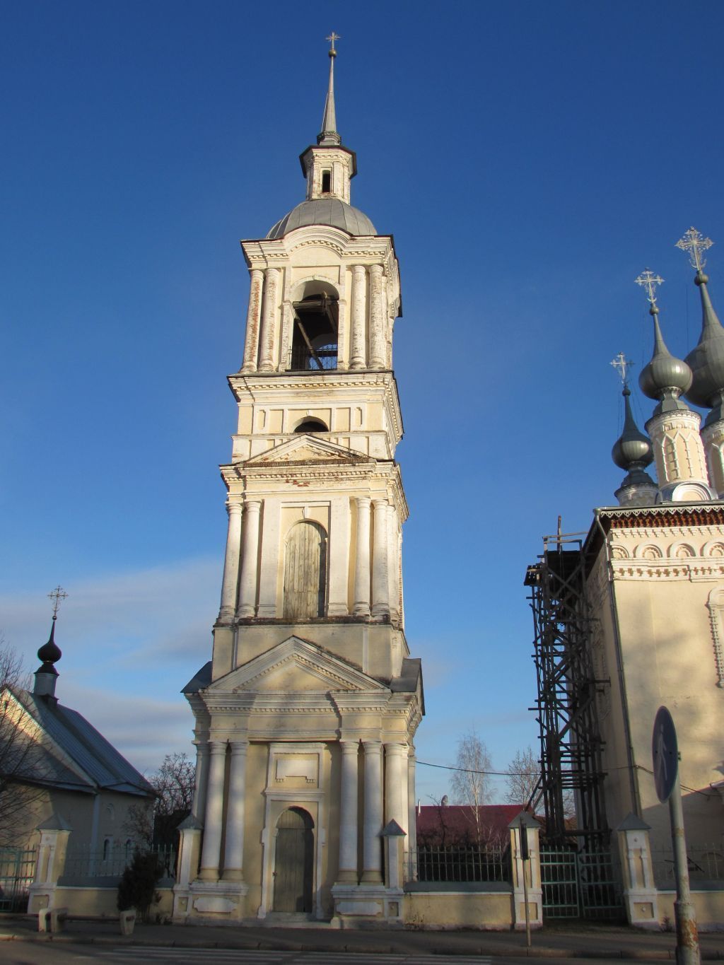 Предмет охраны памятника градостроительства и архитектуры включает в себя следующие характеристики:Стилистическая характеристика: колокольня представляет собой памятник культовой архитектуры эпохи классицизма; Градостроительные характеристики:- местоположение: памятник находится в северной части г. Суздаля, в непосредственной близости от Спасо-Евфимиева монастыря, выходит на линию застройки ул. Ленина. Колокольня входит в комплекс парных посадских храмов, располагаясь между зимней Симеоновской и летней Смоленской церквями по ул. Ленина;- композиционная значимость (роль) в структуре окружающего ландшафта: является высотной доминантой среди двух, рядом стоящих церквей и жилой застройки ул. Ленина;- габариты, силуэт: в плане квадрат, представляет собой четырехъярусную колокольню (три высоких яруса и один полуярус);- секторы и направления видовых раскрытий, визуальные связи памятника: памятник хорошо просматривается со стороны главного фасада, выходящего на ул. Ленина;Архитектурные характеристики:- объемно-пространственная композиция (с исключением пристроек, надстроек и т.д.): представляет собой отдельно стоящую постройку. Композиция колокольни состоит из четырех ярусов (четвериков), завершается полусферической крышей с металлической кровлей, на которую поставлен круглый световой барабан со шпилем;- высотные характеристики: колокольня четырехъярусная, со шпилем;- силуэт и форма крыши: крыша полусферической формы со шпилем и небольшой луковичной главкой на световом барабане; - конфигурация здания, наличие выступающих и западающих частей по фасадам: колокольня в плане квадратная, ярус звона имеет по одному арочному проему с каждой стороны, вход осуществляется с главного уличного фасада через арочный дверной проем;- композиция и архитектурно-художественное оформление фасадов: колокольня четырехъярусная, состоит из четырех поставленных друг на друга четвериков (три высоких яруса и промежуточный полуярус). Завершена колокольня полусферической кровлей, на которую поставлен световой барабан со шпилем, увенчанным маленькой луковичной главкой. Первый, второй и четвертый ярусы украшены пучковыми полуколоннами. Первый и второй ярусы также акцентированы треугольными фронтонами. В завершении каждого яруса проходит профилированный, зубчатый карниз;- виды обработки фасадной плоскости: окраска по штукатурке;- колористическое решение: основной цвет – желтый охристый, декоративные элементы выделены белым цветом;Конструктивные элементы:- фундамент: кирпичный, ленточный;- капитальные стены: сложены из кирпича;- перекрытия: сводчатые, кирпичные;- крыша: полусферическая с повалами, кровля металлическая;- проемы дверные и оконные: дверные проемы арочной формы, заполнения - деревянные двери; оконные проемы арочной формы, без заполнений;- полы: деревянные;- лестницы: кирпичная, деревянная;- Историческая функция: культовая постройка.