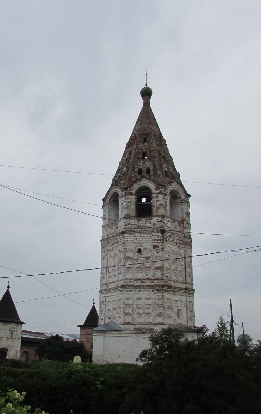 - местоположение и градостроительные характеристики отдельно стоящей столпообразной четырехъярусной шатровой колокольни 1620 - 1680 гг., расположенной в центральной части Михайло-Архангельского монастыря напротив главного входа в него, доминирующей над застройкой парадной Соборной площади, монастыря и окружающих его зданий, формирующей панорамы монастыря с разных сторон света и городские панорамы Юрьева- Польского;- объёмно-пространственная композиция отдельно стоящей каменной столпообразной четырехъярусной шатровой колокольни 1620 - 1680 гг., состоящей из низкого одноэтажного с подклетом «четверика», расположенных над ним двух ярусов «восьмерика», последнего четвёртого открытого верхнего яруса - восьмерика арочного звона, завершенного гуртовым шатром с барабанчиком, луковичной главкой и крестом, в том числе габариты и силуэтные характеристики здания, высотные отметки по ограждению яруса звона, верху шатра, барабана (с учётом реставрационных работ 1960-1970 гг.);- покрытие углов четверика листовым железом, луковичная, крытая керамическим зелёным лемехом главка 1620 - 1680 гг. с металлическим крестом, её конфигурация, материал, конструкция, материал кровельногопокрытия, высотные отметки (с учётом реставрационных работ 1960-1970 гг.);- композиционное решение и архитектурно-художественное оформление фасадов колокольни 1620 - 1680 гг., выполненное в формах древнерусской архитектуры, в том числе местоположение, форма, размер и оформление оконных и дверных проемов, гладкое поле стен первого яруса четверика с угловыми пилястрами, расположенным по центру западного фасада входом в подклет, двумя арочными окнами подклета по сторонам, с выложенными из лекального кирпича рамочными наличниками с треугольными фронтонами, расположенным над входом окном первого этажа четверика с «коруной» на боковых колонках; смещённым к западу южным входом на ярусы колокольни; центральным восточным входом на первый этаж четверика; северным глухим фасадом; завершение четверика карнизом с полочками и поребриком; «ковровое» оформление стен нижнего яруса восьмерика перспективными «ширинками» с центральными вставками и без них, западного арочного окна нижнего яруса восьмерика выложенным из лекального кирпича рамочным наличником с треугольным фронтоном и щелевидное лестничное окно на юго-восточной грани; завершение первого яруса восьмерика карнизом с полочками и поребриком; «ковровое» оформление стен верхнего яруса восьмерика перспективными «киотцами», западного арочного окна верхнего яруса восьмерика выложенным из лекального кирпича рамочным наличником с треугольным фронтоном с нишей для иконы под ним и два щелевидных лестничных окна на южной и на северо- восточной гранях второго яруса восьмерика, завершение второго яруса восьмерика карнизом с полочками, «бегунцом» и поребриком; открытый ярус звона с восемью арками на низких каменных столбах, декорированных резными «дыньками» в нишах и профилированными карнизами, сплошное кирпичное ограждение с декоративными «филёнками», килевидные профилированные наличники; оформление восьмигранного шатра гуртами и тремя рядами арочных «слухов» с наличниками и треугольными фронтонами, в нижнем ряду слухи сдвоены; восьмигранного барабанчика - профилированными карнизами;- отделка фасадной поверхности Памятни