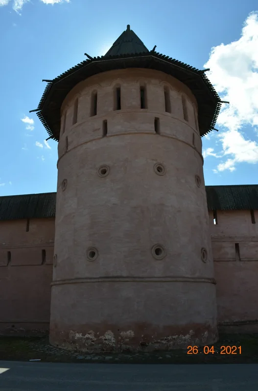 - местоположение в структуре северной стороны укреплений монастыря, в центральной их части;- объемно-пространственные характеристики трехъярусной круглой в плане башни;- структура и декор фасадов, кирпичный декор;- фрагменты первоначального свода в восточной и западной частях первого яруса башни.