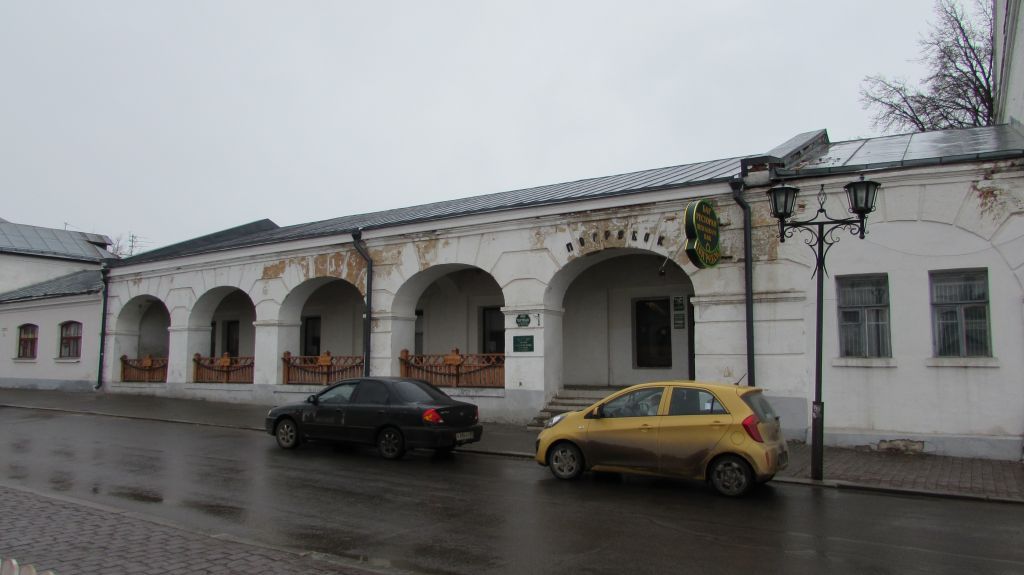 Предмет охраны объекта культурного наследия включает в себя следующие характеристики:Стилистические характеристики: городская постройка, выполненная в формах, характерных для архитектуры торговых зданий н. XIX в.;Градостроительные характеристики:- местоположение: в центре города, в непрерывном ряду застройки нечётной стороны улицы Кремлёвская;- композиционная значимость (роль) в структуре окружающей застройки: здание имеет важное градостроительное значение в композиционно-планировочной структуре центра Суздаля, фиксируя красную линию застройки улицы Кремлёвская;- габариты, силуэт: общие габаритные размеры здания в плане 26м х 17м; силуэт – вытянутый прямоугольник, отделенный от примыкающих зданий брандмауэрами;- высотные отметки: высота здания от уровня улицы Кремлёвская до конька крыши составляет от 8,2м до 8,6м;- секторы и направления основных видовых раскрытий: обзор памятника открывается с северной и южной стороны, наилучшими видовыми ракурсами являются виды на здание с улицы Кремлёвская;Архитектурные характеристики:- объемно-пространственная композиция: прямоугольный одноэтажный объем, перекрытый двускатной металлической кровлей, с аркадой на главном фасаде;- высотные характеристики, перепады высот и высотные акценты в архитектурном решении: здание одноэтажное, с подвалом, на низком цоколе; объем здания имеет единый карниз; высотные акценты отсутствуют; - силуэт и форма крыши: крыша двускатная, ограниченная с торцов брандмауэрными стенами; - конфигурация (наличие выступающих и западающих частей по фасадам): прямоугольник со слабо выраженным ризалитом, включающим две западные арки главного фасада; - композиция и архитектурно-художественное оформление фасадов: на главном фасаде аркада из пяти трехцентровых арочных проемов. Пяты арок опираются на импосты - горизонтальные пояски и плоскими полочками и четвертными валами, венчающие квадратные в плане столбы. Столбы трех восточных арок имеют гладкую поверхность; столбы двух западных арок со стороны улицы декорированы дощатым рустом, выступающим за плоскость стены аркады. Плоскость стены выше импостов декорирована широким клинчатым рустом прямоугольного профиля. Венчает фасад карниз небольшого выноса, состоящий из двух полочек и четвертного вала; - главный фасад имеет десять световых осей, расположенных попарно в арках галереи;- входная группа: главный вход в здание осуществляется через открытую галерею аркады по наружной лестнице, расположенной в крайней правой арке;- оконные проемы прямоугольные, заполнения - деревянные рамы;- виды обработки фасадной плоскости: окраска по штукатурке; - колористическое решение: основная плоскость стены главного фасада - белая, цоколь - серый;- тип планировочной организации и планировочная структура внутренних помещений: планировочная структура в пределах капитальных стен;Конструктивные элементы: - фундамент: кирпичный на бутовом основании; - капитальные стены: выполнены из керамического полнотелого одинарного кирпича на известковом растворе;- перекрытия: кирпичные сводчатые и плоские монолитные железобетонные; - крыша: двускатная металлическая; - оконные и дверные проемы прямоугольной формы.