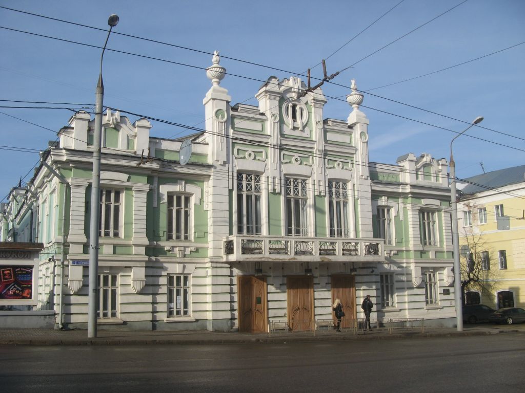 Градостроительные характеристики:- местоположение: памятник расположен в центральной части города, восточный (главный) фасад расположен по линии застройки ул. Гагарина, северный фасад – по линии застройки ул. 2-я Никольская;- композиционная значимость (роль) в структуре окружающего ландшафта: является важным элементом застройки центральной части города по ул. Гагарина;- габариты, силуэт: в плане – прямоугольник, вытянутый с востока на запад; габаритные размеры – 57,9 х 25,3 м;- секторы и направления видовых раскрытий, визуальные связи памятника: здание хорошо просматривается с севера, юга и востока.Архитектурные характеристики:- объемно-пространственная композиция: основной объем здания имеет сложную объемно-пространственную структуру, включая западную пристройку: параллелепипед с вытянутыми по оси восток-запад пропорциями. Главный вход осуществляется через три центральных двери со стороны восточного фасада;- высотные характеристики: двухэтажное и частично трехэтажное в западной части здание, с подвалом; - крыша: скатная с вальмами, двускатная, кровельное покрытие из листового металла с устройством фальцев; - высотные отметки по венчающим карнизам основного объема здания от верха цокольного пояса: двухэтажный объем здания – центр восточной части 9,86 м, северо-восточная и юго-восточная части 7,84 м, западная часть 7,1 м; трехэтажный объем здания 10,5 м, кроме восточного карниза над сценой 11,82 м;- высотные отметки по венчающему карнизу западной пристройки - от верха цокольного пояса 10,65 м;- высотные отметки основного объема по коньку крыш относительно венчающих карнизов: двухэтажный объем здания – центр восточной части 2,74 м, северо-восточная и юго-восточная части - 2,0 м, западная часть - 4,05 м; трехэтажный объем здания - 3,0 м;- высотная отметка конька крыши западной пристройки относительно венчающего карниза - 4,84 м;- конфигурация здания памятника (наличие выступающих и западающих частей по фасадам): средняя часть главного восточного фасада, а также боковые, отмечены небольшими ризалитами, над главным входом на восточном фасаде расположен балкон; два ризалита расположены на южном фасаде; восточная часть здания по северному фасаду немного выступает, западнее расположены еще два ризалита; на 3-м этаже западного фасада устроен балкон;- композиция и архитектурно-художественное оформление фасадов: основной объем здания декорирован в стиле модерн: 1-й этаж, покрытый дощатым рустом, отделен от более высокого 2-го этажа межэтажным поясом; главный фасад имеет трехчастную структуру и отличается подчеркнутой нарядностью декора – средняя его часть в три оси проемов выделена небольшим ризалитом с пилястрами на углах и высоким, обильно декорированным аттиком; боковые части фасада также отмечены легкими ризалитами, завершенными криволинейными аттиками; аттик центрального ризалита ограничен по краям высокими фигурными тумбами-постаментами; в центре помещено круглое окно, разделенное на три части вертикальными стойками, в сложном обрамлении: уступчатая рамка дополнена лучковой бровкой, замковым камнем и скульптурным гребнем над ней; по сторонам поставлены пилястры с тумбами; характерен типичный для модерна декор постаментов и пилястр: ступенчатые языки-спуски и рельефные кольца, пересеченные вертикальными тягами; в систему декора центральн