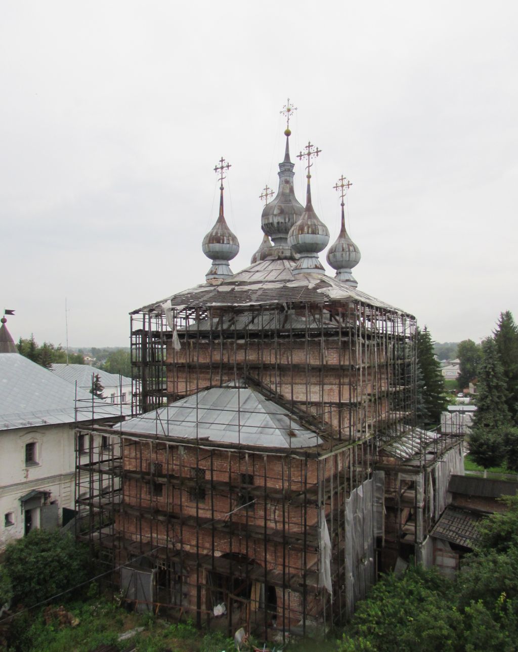 − местоположение и градостроительные характеристики Памятника, расположенного между двумя пряслами в линии западной стены монастыря, формирующей фронт застройки улицы 1 Мая города Юрьева-Польского и основные видовые панорамы Михайло-Архангельского монастыря;− объёмно-пространственная композиция каменного двусветного бесстолпного пятиглавого надвратного Богословского храма 1654-1670 гг., 1792 г., состоящего из расположенных по оси запад-восток двух широких арочных проездных с боковыми печурами ворот, перекрытых коробовым сводом с подпружными арками, с двухъярусной каменной галереей, обходящей Святые врата и первый свет четверика с запада, севера и юга, с примыкающими к северной галерее одноэтажными объёмами сторожки и кельи, с поставленными над Святыми воротами двусветным четвериком храма и прямоугольной в плане пониженной односветной одночастной апсидой, вытянутой по поперечной оси; увенчанным центральным световым барабаном и четырьмя боковыми глухими барабанчиками с фигурными луковичными главками с «юбками» и крестами четвериком, в том числе габариты и силуэтные характеристики здания, высотные отметки по венчающим карнизам обходной галереи, основного четверика храма, прямоугольной апсиды, барабанов с главками (с учётом реставрационных работ 1960-1970 гг.);− трехскатная крыша алтаря, односкатная крыша обходной галереи, четырехскатная крыша купола четверика, луковичные главки с «юбками» начала XIX в., покрытые листовым железом, увенчанные восьмиконечными крестами, их конфигурация, конструкция, материал, материал кровельного покрытия, высотные отметки (с учётом реставрационных работ 1970 гг.);− композиционное решение и архитектурно-художественное оформление фасадов надвратного Богословского храма 1654–1670 гг., 1792 г., в том числе, местоположение, размеры, форма, декоративное оформление двух проездных арок Святых врат 1654 года, расположенных внутри объёма галереи, декорированных с западного фасада по сторонам внешней поверхности арок вертикально расположенными перспективными «ширинками», а по верху – пояском из поставленных на ребро лекальных кирпичей, образующих чередующиеся выступы и ниши; местоположение, размеры, форма, декоративное оформление арочной двухэтажной галереи 1670 г. на фигурно подтёсанных столбах, украшенной на углах крупными перспективными вертикально расположенными «ширинками» с репейками, переходящими во втором этаже в горизонтальный междуэтажный шириночный пояс, угловые сдвоенные полуколонки 2 яруса галереи с круглыми репейками и ромбиками, плоские ниши между окнами второго этажа галереи, декоративные пояса арочных и оконных проёмов из «бровчатого» поребрика, имитирующие форму арок с импостами первого яруса галереи и окон второго; венчающий профилированный карниз двухэтажной галереи; плоские лопатки первого этажа апсиды, её междуэтажный профилированный карниз, рустованные угловые пилястры второго этажа, плоские ниши между окнами с рамочными наличниками и венчающий карниз с «сухариками»; три перспективных портала с резными бусинами входных проемов, ведущих из галереи в четверик; фриз из двух рядов нишек, венчающий профилированный карниз, профилированные циркульные кокошники, дополненные поребриком с валиками; барабаны боковых главок, декорированные высоким аркатурным поясом с полук