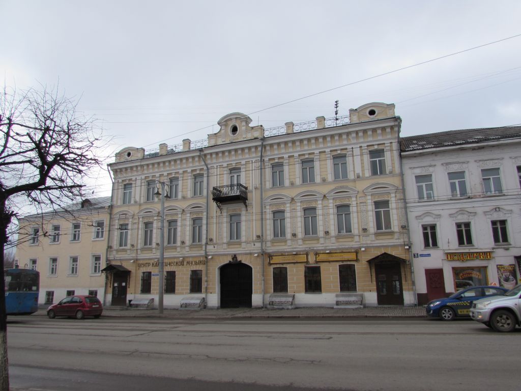 Стилистическая характеристика: здание представляет собой образец позднего классицизма и эклектики с элементами модерна;Градостроительные характеристики:- местоположение: здание расположено в историческом центре города Владимира, главный северный фасад выходит на линию застройки ул. Большая Московская;- композиционная значимость (роль) в структуре окружающего ландшафта: является значимым акцентом в линии застройки центральной части ул. Большая Московская;- габариты, силуэт: габаритные размеры основного объема дома в плане 25м х 16м, южных пристроек – 8,8м х 13,5м. Силуэт здания характеризуется прямоугольной формой основного объема, перекрытого вальмовой крышей;- высотные отметки: высота здания от уровня земли до верха карниза здания по южному дворовому фасаду – 12,6 м, высота флигелей – 9,8 м; высота здания до конька крыши – 16,42 м, высота флигелей – 12,3 м;- секторы и направления основных видовых раскрытий: обзор памятника открывается с северной стороны, наилучшим видовым ракурсом является вид на памятник с северной стороны (со стороны «Гостиного двора», 1787-1792 гг.);Архитектурные характеристики:- объемно-пространственная композиция (с исключением пристроек, надстроек и т.п.): в объемном решении композиция трехчастная: прямоугольный трехэтажный объем главного здания фланкируют два одинаковых объема флигелей, образуя П-образное в плане здание. Из-за отсутствия парадного этажа, флигеля ниже по высоте основного объема. В объемно-пространственной композиции выделяется главный объем, перекрытый двускатной кровлей, флигеля перекрыты вальмовой кровлей;- высотные характеристики, перепады высот и высотные акценты в архитектурном решении: здание трехэтажное;- силуэт и форма крыши: крыша здания двускатная, на южном скате расположены два слуховых окна, объемы флигелей перекрыты трехскатными вальмовыми кровлями, имеют по одному слуховому окну, обращенному внутрь двора;- конфигурация здания (наличие выступающих и западающих частей по фасадам): здание П-образное в плане, сориентировано по оси север-юг. Не имеет боковых фасадов. - композиция и архитектурно-художественное оформление фасадов: композиция северного фасада построена по классической схеме, строго симметрична. Его центральная и боковые оси выделены слабо выступающими ризалитами, завершенными фигурными аттиками. Центральная ось фасада выделена в первом этаже аркой проездных ворот, в третьем – балконом с ажурной металлической решеткой, завершение – фигурный аттик на ширину ризалита с овальным окном в центре. Крайние оси фасада акцентированы ризалитами с парадными входами в первом этаже и меньшими аттиками в завершении. Первый этаж рустован, цоколь - гладкий. Второй и третий этажи отделены поясом, включающим лежачие нишки, второй и третий – полочкой в два уступа, проходящей в основании верхних проемов. Сильно выступающий венчающий карниз поддерживают преувеличенно крупные, часто поставленные модульоны. Аттики и расположенные между ними парапетные тумбы соединяет металлическая решетка.Входная группа: главный вход расположен с северного фасада.Оконные проемы: расположены ритмично по фасадам здания. На первом этаже окна лишены наличников и имеют слабовыраженные лучковые перемычки, а руст над ними имитирует веерные замковые камни. На втором этаже окна большего размера, фла