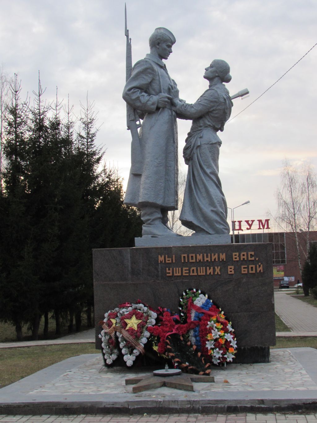 Предмет охраны объекта культурного наследия включает в себя следующие характеристики:Градостроительные характеристики:- местоположение: расположен в центральной части города на ул. Победы;- секторы и направления основных видовых раскрытий, визуальные связи памятника: хорошо просматривается с прилегающих улиц. Архитектурные характеристики:- скульптурная композиция, состоящая из двух фигур, установленных на прямоугольном постаменте. Первая фигура изображает солдата в шинели, пилотке и сапогах с винтовкой на плече, уходящего на фронт, вторая – провожающую его женщину. На постаменте надпись: «Мы помним вас, ушедших в бой 1941-1945». На площадке перед памятником находится пятиконечная звезда с вечным огнём;- материал: постамент облицован гранитными плитами, скульптура каменная.