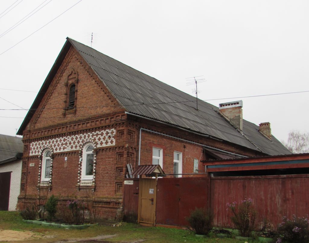 Стилистическая характеристика: здание относится к типу «мальцовских» домов, имеет историческую и градостроительную ценность как объект, связанный с историей формирования градостроительной структуры города. Градостроительные характеристики:-местоположение: на пересечении ул. Первомайская и переулка Текстильщиков, главным фасадом ориентирован на ул. Первомайская.-силуэт: прямоугольный.-секторы и направления видовых раскрытий, визуальные связи памятника: главный фасад просматривается с ул. Первомайская, дворовый и боковые фасады просматриваются со стороны переулка и с территории объекта. Архитектурные характеристики:-объемно-пространственная композиция: прямоугольный, одноэтажный с подвалом объем, вытянутый вглубь участка, под двухскатной кровлей с полицами и высоким кирпичным фронтоном.-высотные характеристики: здание одноэтажное.-силуэт и форма крыши: двускатная.-композиция и архитектурно-художественное оформление фасадов: углы объема зафиксированы лопатками с ширинками; на них раскрепованы отделяющий цоколь пояс поребрика, заключенный между двумя полувалами, и венчающий стены фриз на ступенчатых кронштейнах, состоящий из квадратных нишек. Горизонтальные членения дополнены полочкой с городками, проходящей по фасадам на уровне коробовых перемычек окон. Главный фасад имеет симметричную композицию и прорезан двумя окнами, наличники которых состоят из опирающихся на кронштейны колонок с перехватами и капительками, архивольта и ряда поребрика под проемом. В тимпане фронтона - небольшое арочное окошко, закрытое деревянными жалюзи. Его наличник похож на обрамления проемов основного этажа, но завершен килевидным очельем. В верхней части стены, между фризом и полочкой, проходит расписной орнаментальный пояс с использованием беленого кирпича.-виды обработки фасадной плоскости: необработанный кирпич.-колористическое решение: декоративные элементы выделены побелкой. Конструктивные элементы:-капитальные стены, перегородки: глиняный кирпич.-крыша: стропила и обрешетка деревянные, кровля - металлическая с фальцами.-проёмы дверные и оконные: оконные проемы арочной формы, заполнения - деревянные рамы с переплетами. Слуховое окно фронтона - арочной формы. Дверные проемы прямоугольной формы, заполнения - деревянные филенчатые двери. Историческая функция: жилой дом.