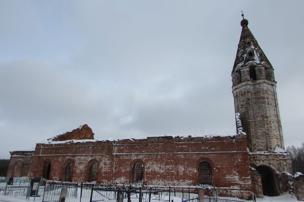 Предмет охраны памятника градостроительства и архитектуры включает в себя следующие характеристики:Стилистическая характеристика: пример культовой постройки с колокольней, выполненной в древнерусском стиле.Градостроительные характеристики: - местоположение: на краю села, на старом кладбище;- секторы и направления видовых раскрытий, визуальные связи памятника: хорошо просматривается со всех четырех сторон света;Архитектурные характеристики:- объемно-пространственная композиция: представляет собой трехчастный храм, с северной стороны к которому пристроен северный придел; с западной стороны от церкви находится высокая шатровая четырехъярусная колокольня (восьмерик на четверике), к которой примыкает сама церковь; колокольня является центральным элементом в пространственно-объемной композиции;- силуэт и форма крыши: основной объем, трапезная, придел – двускатная, колокольня - шатровая;- композиция и архитектурно-художественное оформление фасадов: плоские и рустованные пилястры; профилированный карниз и ряд «поребрика» в завершении стен; ярус звона колокольни украшен «слухами», под ярусом звона идет ряд «поребрика»;- виды обработки фасадной плоскости: побелка по штукатурке;- пространственно-планировочная структура интерьеров: помещения соединяются арочными проемами;Конструктивные элементы:- фундамент: булыжный;- капитальные стены: здание церкви сложено из кирпича на известковом растворе (размеры кирпича 270х1201х50); здание колокольни сложено из большемерного кирпича, размеры которого составляют 250-300х120-130х140-150;- перекрытия: апсида перекрыта конхой; основной объем – коробовый свод; трапезная прямоугольной формы перекрыта коробовым сводом, в западной части сходящимся в лоток; северный придел перекрыт коробовым сводом, в восточной части переходящим в конху; нижний ярус колокольни перекрыт двумя пересекающимися коробовыми сводами;- крыша: стропила и обрешетка – деревянные; кровельное покрытие – кровельная сталь;- проемы дверные и оконные: оконные проемы арочной формы с широкими откосами и распалубками, заполнения – деревянные рамы с переплетами, кованые металлические решетки; дверные проемы арочной формы, заполнения – деревянные филенчатые, металлические кованые двери.