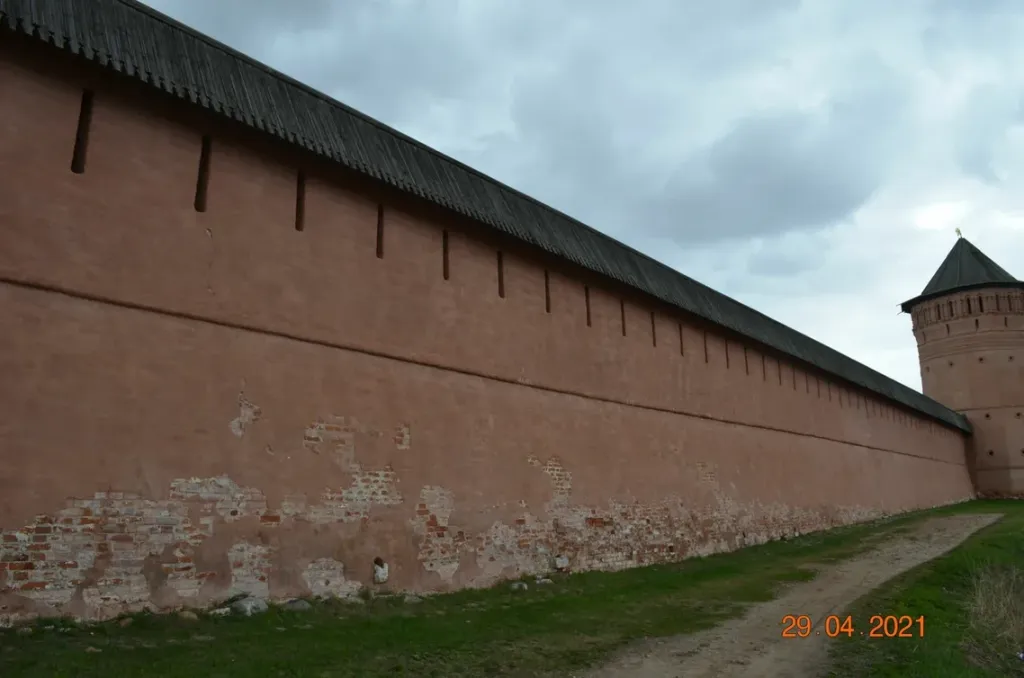 - местоположение по южной границе ансамбля;- объемно-пространственные характеристики стены без бойниц подошвенного боя и машикулей, с глухой аркадой боевого хода, состоящей из 14 полуциркульных арок и одной ползучей в южной части стены, над которой устроена внутристенная лестница, с внутренней стороны монастыря;- архитектурные и конструктивные характеристики оборонного сооружения;- структура и декор фасадов, кирпичный щипец XIX века.
