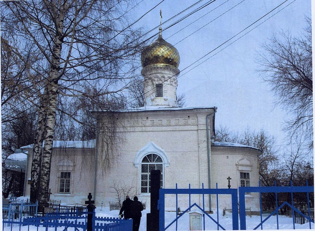 Стилистическая характеристика (неорусский стиль). Градостроительные характеристики: -местоположение (храм расположен на старом приходском кладбище, находится в южной части кладбища, не выходит на линию застройки улиц); -композиционная значимость (роль) в структуре окружающего ландшафта (объект, формирующий основное композиционное ядро кладбища, является высотной доминантой); -габариты, силуэт (общие габаритные размеры храма в плане11,8x22,4м, силуэт характеризуется доминированием основного объема со световым барабаном и луковичной главой, основному объему подчинены низкая трапезная часть и алтарь); -секторы и направления видовых раскрытий, визуальные связи памятника (обзор на памятник открывается с южной, юго-восточной сторон, наилучшим видовым ракурсом является юго-восточный вид на храм и вид со стороны ул. Ярославского).Архитектурные характеристики: -объемно-пространственная композиция (все объемы храма расположены по оси запад-восток: с запада к четверику примыкает пониженная, квадратная в плане трапезная, с востока к основному объему примыкает полукруглая апсида; трапезная под двускатной кровлей более низкая и узкая, чем четверик, по высоте равна апсиде); -высотные отметки (высота от уровня земли до верха карниза трапезной -6,3м, высота от уровня земли до верха карниза алтаря - 6,3м, высота от уровня земли до верха карниза основного объема - 9,1м, общая высота основного объема с главой и крестом - 16,0м); -перепады высот и высотные акценты в архитектурном решении (имеется перепад высот между трапезной и основным объемом, разница в высотах между основным объемом и алтарной частью, акцентом общей архитектурно-пространственной композиции выступает четверик основного объема); -силуэт и форма крыши (крыша основного объема четырехскатная, крыша трапезной двухскатная с фронтоном, крыша алтаря полуконическая с низким подъемом); -завершение (по центру основного объема расположен круглый световой барабан с луковичной главой, увенчанной восьмиконечным металлическим крестом на подкрестном шаре); -конфигурация здания, наличие выступающих и западающих частей по фасадам (основной объем квадратный в плане, трапезная и апсида имеют меньшую ширину, чем основной объем); -композиция и архитектурно-художественное оформление фасадов: 1)основной объем: угловые пилястры, широкий венчающий карниз, состоящий из трех напусков кирпича и белокаменного профилированного карнизного свеса, во фризе расположены ниши со вставленными в них белокаменными резными розетками; световой барабан орнаментирован аркатурно-колончатым поясом, имеет городчатый карниз; 2)трапезная и апсида: кирпичные карнизы простого профиля, состоящие из напусков кирпича, угловые пилястры на фасаде трапезной; 3)оконные проемы храма имеют наличники, состоящие их прямых боковых лопаток, профилированных белокаменных подоконных поясков и килевидных завершений в виде кокошников с профилированными карнизами, на наличниках окон основного объема имеются боковые прямоугольные серьги, под окнами основного объема расположены ниши-ширинки, на окнах трапезной и алтаря кокошники поддерживаются профилированным карнизом, расположенным на декоративных кронштейнах; 4)окна светового барабана прямоугольные с прямым верхом, имеют замковые камни; 5)входной дверной проем обрамлен наличником, с