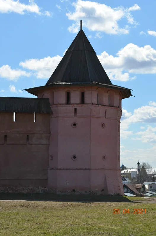 - местоположение на пересечении западной и северной стен монастыря;- объемно-пространственные характеристики трехъярусной восьмигранной башни;- структура и декор фасадов, кирпичный декор, включая: угловые лопатки, зубчатые машикули, форму бойниц, киот над проездной аркой южного фасада;- дверные проемы в уровне второго и третьего ярусов;- сводчатое перекрытие над 1-м ярусом.