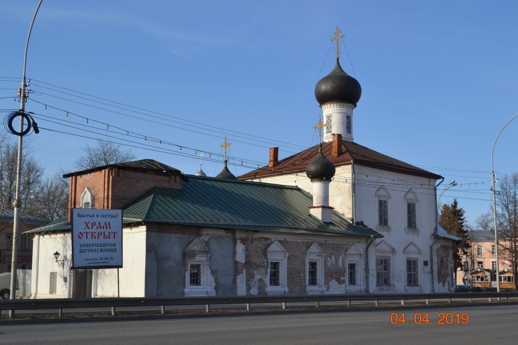 Градостроительное значение:- церковь как одна из доминант исторического центра – «Города»;- перспектива и визуальные точки обозрения церкви: Торговая площадь, проспект Победы, ул. С. Орлова;- формирующий исторически сложившийся силуэт элемент в развертках Торговой площади, проспекта Победы, ул. С. Орлова;- сохранившийся фрагмент «Детинца» Вологодского Кремля.Объёмно-пространственная и конструктивная схема:- продольно-осевая композиция храма, состоящая из двухсветного кубического четверика основного храма с примыкающими с востока апсидой, по форме приближающейся к полукружию, а с запада – трапезной, соединяющей церковь с колокольней;- исторические конструкции (тип, конструкции и материал):•фундамент (напрямую не обследован, может быть уточнён в рамках проведения детального обследования при разработке научно-проектной документации);•наружные и внутренние капитальные стены – кирпичные;•металлические связи;•перекрытия в исторических отметках: сводчатые, оштукатуренные, с распалубками от дверных и оконных проёмов, полулотковый свод трапезной с распалубками;•конструктивная схема и материал стропил;•историческая конфигурация кровель; •историческое цветовое решение и характер кровельного покрытия (могут быть уточнены в рамках проведения детального обследования при разработке научно-проектной документации);- размеры здания (могут быть уточнены в рамках проведения детального обследования при разработке научно-проектной документации):•основные габариты плана;•высотные отметки;- характер и расположение входов в здание: главный вход на юго-западном фасаде, второй вход - на северо-западном фасаде;- покрытие кровли: кровельное железо с покраской (исторический колер);- возможно воссоздание верхних ярусов колокольни в соответствии с их историческим расположением, формой, габаритами, высотными отметками, декоративным решением и типом завершения – шатровым (на основе историко-архивных материалов).Композиция и архитектурно-художественное оформление фасадов:- внешний облик исторического объёма здания и его частей, декоративное убранство фасадов:•цоколь здания, усложнённый полуваликом и уступами;•вход в храм на юго-западном фасаде, декорированный перспективным порталом с рядом арок и колонн;•углы всех объемов, подчеркнутые плоскими лопатками, раскрепованными у карниза;•апсида, декорированная полуколонками;•венчающие карнизы всех объемов церкви, усложнённый карниз центральной главы храма из рядов фигурного кирпича;•киот над центральным оконным проемом апсиды;•окна обрамлены наличниками с венчающими треугольной формы навершиями (за исключением оконного проема, расположенного на юго-западном фасаде);•килевидный наличник оконного проёма второго яруса колокольни;- характер отделки стен – штукатурка, покраска;- исторический колер фасадов и декоративных элементов;- над четвериком храма - круглый световой барабан, над которым - луковичная глава, покрытая железом «в шашку» и увенчанная ажурным крестом на растяжках;- над объемом трапезной - два идентичных симметрично расположенных глухих барабана вытянутой формы, устроенных на квадратных в плане основаниях, с меньшими луковичными главами и крестами с растяжками;- местонахождение, форма, размер, оформление, исторический материал оконных и дверных проемов, р