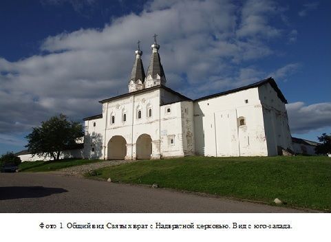 Местоположение Святых ворот, их градостроительные и силуэтные характеристики, габариты и роль в композиционно-планировочной структуре ансамбля монастыря.Объемно-пространственная композиция Святых ворот 2-й четверти XVI – середины XIX в., включая проездные арки ворот, перекрытые коробовыми сводами, церкви с двумя восьмериками и шатрами, боковые пристройки и высотные отметки по венчающему карнизу (с учетом работ по реставрации и приспособлению начала ХХ в.).Строительный материал (кирпич, гранит).Две главки на глухих барабанах, их конфигурация, конструкция, характер покрытия и металлические кресты.Крыши, их конструкция, конфигурация, характер кровельного покрытия и высотные отметки по конькам.Композиционное решение и архитектурно-декоративное оформление фасадов 2-й четверти XVI – середины XIX в., в том числе местоположение, форма, размер и декоративное оформление оконных и дверных проемов (портал и наличники с килевидным завершением, профилированные наличники), лопатки, киоты, филенки, антаблементы с фризами, междуэтажный и венчающий карнизы, кокошники (с учетом работ по реставрации и приспособлению начала ХХ в.).Характер столярных заполнений воротных, дверных и оконных проемов, включая двустворчатое щитовое полотно большого проема ворот (с учетом реставрационных работ конца ХХ – начала ХХI в.). Колористическое решение фасадов 2-й четверти XVI – середины XIX в. (уточняется по результатам реставрационных исследований).Характер отделки поверхности фасадов 2-й четверти XVI – середины XIX в., в том числе гранитный цоколь, обмазка по кирпичу с побелкой (с учетом работ по реставрации и приспособлению начала ХХ в.). Пространственно-планировочная структура интерьера 2-й четверти XVI – середины XIX в. в пределах капитальных стен и перекрытий, включая форму и размер дверных проемов (с учетом работ по реставрации и приспособлению начала ХХ в.).Капитальные стены, сводчатые 2-й четверти XVI – середины XIX в., их конструкции и материал, включая коробовые и крестовые своды, арку, разделяющую церкви, воздушные железные и деревянные связи (с учетом работ по реставрации и приспособлению начала ХХ в.).Архитектурно-декоративное оформление интерьера середины XVII – середины XIX в., включая керамические плитки пола, перспективный портал, двустворчатую щитовую дверь входного проема.Расписные тябла иконостасов XVII в. и каркасные иконостасы конца XVIII в., их конструкция, материал, декоративное и колористическое решение, включая деревянную резьбу и позолоту.Престолы в алтарях церквей, их конструкция, материал, размеры и форма.Живописное оформление интерьера середины XIX в., включая росписи стен и сводов в церквях.