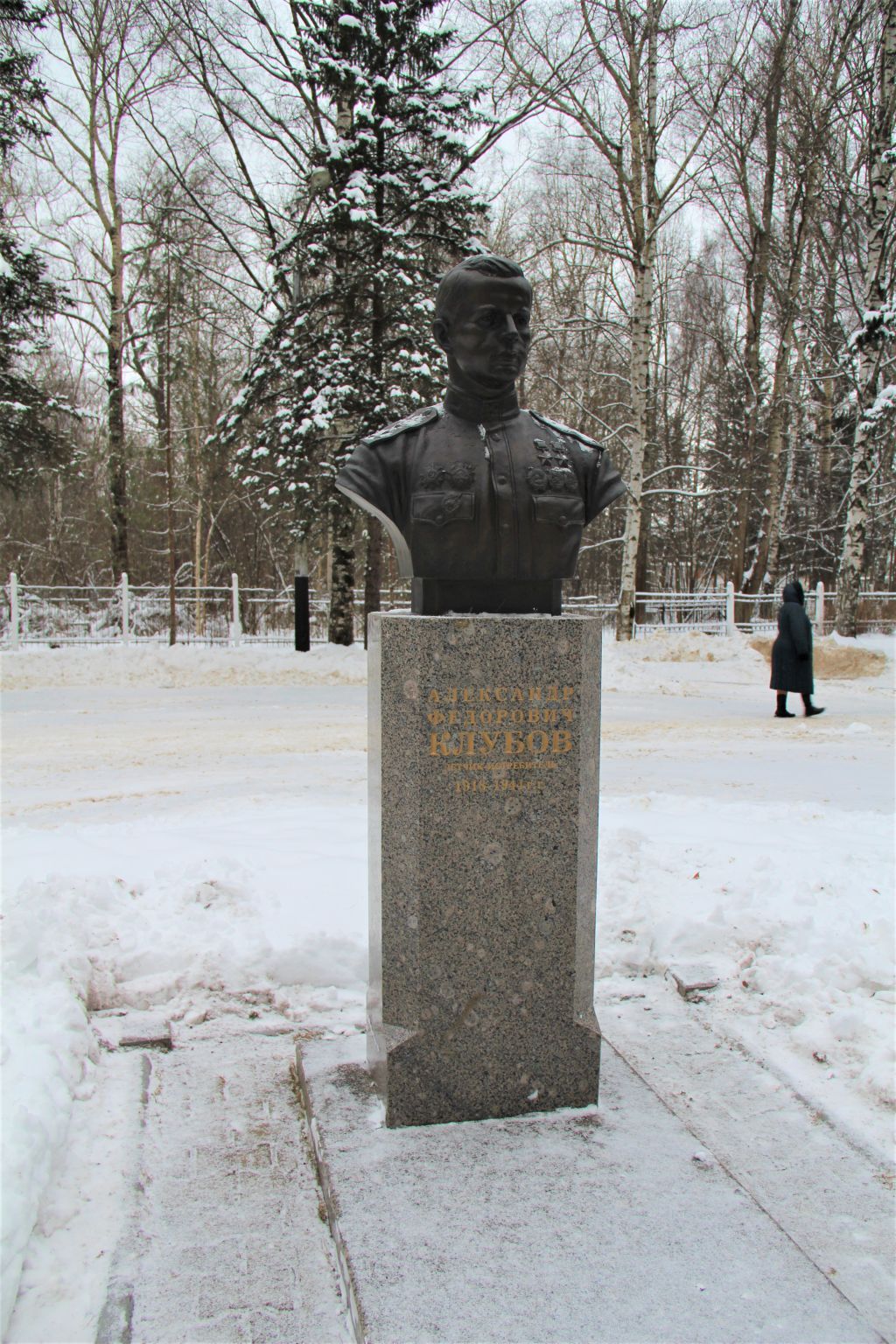 Объект: «Могила, в которой похоронен А.Ф.Клубов (1918-1944), дважды Герой Советского Союза»;Вид объекта: памятник.Предмет охраны:1. Местонахождение: Вологодская область, г. Вологда, Введенское мемориальное воинское кладбище.2. Время создания: ноябрь 1944 г., 19 августа 2001 г.3. Останки (учтенные) со всеми находящимися в погребении материальными предметами (при наличии).4. Объемно-пространственная композиция и архитектурно-художественное оформление: Надмогильный памятник в форме постамента со скульптурой (бюстом) по проекту архитектора Г.И. Виноградова, череповецкого скульптора А.М. Шебунина.Постамент скульптуры из двух частей разного уровня: нижняя – четырехгранная, прямоугольной формы, гранитная цельная плита светло-коричневого с вкраплениями цвета, размером 180х90х10 см; верхняя – четырехгранная, со скошенными углами, ширина малых граней около 25 см, и некоторым расширением в нижней части за счет выступов контрфорсов по углам, из цельного куска гранита темно-коричневого цвета, размерами 125х56х42 см.Скульптура – бюст: грудь, плечи и голова объемной, трехмерной формы, в легком развороте влево, соблюдение пропорций, портретные сходства, из бронзы, способом отливки. Высота бюста 93 см, высота памятника с бюстом – 218 см.Бюст героя в военной форме в звании капитана военно-воздушных сил, с наградами: слева в первом ряду – две звезды героя Советского Союза, во втором ряду – орден Ленина и два Ордена Красного Знамени (орден «Красное знамя»). На правой стороне груди, в первом ряду – Орден Отечественной Войны I степени и Орден Александра Невского; во втором ряду – Нагрудный знак «Гвардия».5. Мемориальная надпись: «АЛЕКСАНДР ФЕДОРОВИЧ КЛУБОВ 1918-1944 гг.», на верхней части постамента золотая краска.6. Особенности композиции: - Композиционная взаимосвязь с другими памятниками на аллее мемориального комплекса Боевой Славы. Расположение – правее от входа, в середине центральной аллеи комплекса Боевой Славы (напротив ул. Ольховой).- Расположение постамента на мощеной площадке (3х1,86 м) из тротуарной плитки с четырьмя гранитными столбиками (размером 0,16х0,16 м), с трех сторон к которой примыкает цветочная клумба восьмигранной формы площадью 22,32 м2 (длина грани 240 см).7. Конструкции и материалы: мрамор, гранит, бронза.