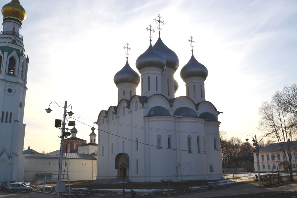 Градостроительное значение здания в составе комплекса: расположен в восточной части ансамбля, вне крепостных стен, в непосредственной близости к реке Вологда; восточный фасад ориентирован на реку и на Зареченский посад, через который проходила дорога на Архангельск;Объемно-пространственная и планировочная композиция здания: кирпичное, на известковом растворе с затиркой швов; размеры кирпича 33х16х9 см; длина до полукружий апсид – 31,65 м; ширина – 25,9 м; высота до сводов – 38,4 м; общая высота (с крестом центральной главы) – 59,65 м; храм шестистолпный, пятиглавый, трехапсидный, трехъярусный; центральная глава собора смещена к алтарной, восточной части; западные главы расположены по центральной оси помещения храма; восточные главы расположены над Предтеченским и Стратилатовским приделами алтаря; перекрытия крестовые сводчатые; характер обработки фасадных поверхностей: штукатурка, окраска;Композиция и архитектурно-художественное оформление фасадов: конфигурация кровли и характер кровельного покрытия; местоположение, размер и форма оконных и дверных проемов; тип и рисунок столярных заполнений оконных и дверных проемов; членение северного и южного фасадов пятью лопатками-пилястрами простого профиля на четыре широкие гладкие прясла; полуциркульные закомары, завершающие прясла; три входа по осям центрального барабана, представляющие собой перспективные порталы с килевидными завершениями; открытое крыльцо с гранитными ступенями и росписью под козырьком у портала южного фасада; членение западного фасада четырьмя пилястрами на три прясла; три полукружия апсид восточного фасада, колонки между апсидами, перекрытия апсид по сферической поверхности; закомарное завершение собора, водометы между закомарами; луковицы глав, расположенные на высоких мощных барабанах; металлические прорезные кресты; многопрофильные карнизы; профили тяг, пилястр, наличников;Пространственно-планировочная структура и элементы архитектурного оформления интерьеров здания: планировка здания в капитальных стенах; шесть мощных квадратных в плане столбов, поддерживающих крестовые своды; пятиярусный иконостас 1744 года; металлические сквозные врата; архиерейские гробницы; настенная живопись, фрески, датируемые 1686 годом; внутристенная лестница в северо-западном углу храма, ведущая на кровлю.