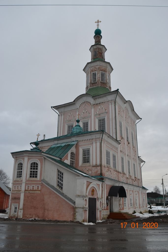 Градостроительное значение:- градостроительная роль здания в формировании застройки исторической части города Тотьмы (исторически сложившийся силуэт в развёртках ул. Ленина, ограниченной ул. Урицкого и ул. Советской, и ул. Октябрьской, ограниченной ул. Ленина и ул. Белоусовской;– здание как одна из высотных доминант исторической части города Тотьмы;- перспектива и визуальные коридоры обозрения церкви с ул. Ленина, Чкаловского пер., Комсомольского пер., Пушкинского пер., Речного пер., ул. Советской, ул. Белоусовской, ул. Кирова, ул. Октябрьской, ул. Урицкого и ул. Бабушкина.Объёмно-пространственная и конструктивная схема:- вытянутое по оси запад–восток двухэтажное здание с первым этажом, состоящее из: храма с примыкающими с востока более узкой пятигранной апсидой, с запада - чуть большими по ширине, но равными между собой, трапезной и папертью, крыльцом с семигранным рундуком; второй этаж, состоящий из: одноглавого двухсветного храма, размещённого над трапезной первого этажа с примыкающими с востока более узкой пятигранной апсидой, а с запада - равной по ширине папертью, сообщающейся с рундуком крыльца посредством висячего перехода;- исторические конструкции (тип, конструкции и материал):•фундамент*;•наружные и внутренние капитальные стены – кирпичные;•металлические связи;•перекрытия в исторических отметках: паперть первого этажа, перекрытая коробовым сводом с распалубками над проёмами, трапезная – коробовым сводом с лотком с западной стороны и распалубками над оконными и дверными проёмами, храм – коробовым сводом с распалубками над окнами, апсида – гранёным полусомкнутым сводом с распалубками над окнами, помещение под рундуком крыльца – сомкнутым сводом, перекрытие рундука – балочное (деревянное); паперть второго этажа, перекрытая коробовым сводом с западным лотком и распалубками над всеми проёмами, храм – крутым сомкнутым сводом, прорезанным восьмигранным барабаном, апсида – гранёным полусомкнутым сводом с лотком с запада и распалубками над центральным проёмом и всеми окнами;•конструктивная схема и материал стропил (дерево);•историческая конфигурация кровель: над четвериком храма – гранёная купольная кровля сложной формы, над апсидами – пятискатные, над приделом – вальмовая, над крыльцом – односкатные, над рундуком крыльца – семискатная;•историческое цветовое решение*, характер кровельного покрытия (кровельное железо с покраской) и отливов; подшивка карниза – деревянные доски;•глава храма (конструкция, материал и покрытие): из трёх барабанов, устроенных друг на друге, уменьшающихся по размеру к главке и перекрывающихся купольными кровлями; главка, устроенная на высокой юбке и увенчанная золочёным крестом на растяжках;•малые главки с крестами (конструкция, материал и покрытие) над апсидами, папертью и рундуком крыльца;•конструкция полов, материал и покрытие*;- размеры здания:•основные габариты плана*;•высотные отметки*;- характер и расположение входов в здание: в нижний храм – через дверной проём объёма паперти, расположенный на южном фасаде; в верхний храм – через крыльцо.Композиция и архитектурно-художественное оформление фасадов:- внешний облик исторического объёма здания и его частей, декоративное убранство фасадов:•цоколь, состоящий из лекального кирпича и включающий в себя ряд поребрика;•о