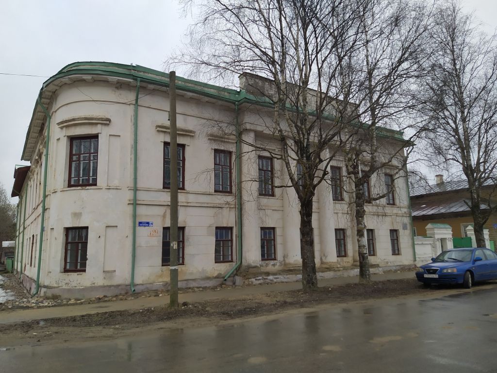 ИСТОРИЧЕСКИЙ ОБЪЕМ ЗДАНИЯГрадостроительное значение:- является частью комплекса исторической застройки квартала и города Кириллова;- перспектива и визуальные точки обозрения с ул. Гагарина и ул. Дзержинского; - силуэт основного объёма в развертках ул. Гагарина и ул. Дзержинского;- фиксирует угол квартала, закрепляя регулярную сетку улиц.Объемно-пространственная и конструктивная схема:- исторические конструкции (тип, конструкция и материал наружных и внутренних капитальных стен, перекрытий, стропильной системы, конфигурация кровли);- каменное, оштукатуренное здание на бутово-ленточном фундаменте с выступающей цокольной частью;- высотные отметки и пропорции;- основные габариты в плане - 18 х 22 м;- прямоугольное со скругленным северо-западным углом в плане здание с центральным ризалитом портика на западном фасаде;- двухэтажный объём здания завершён аттиковой стенкой под скатной кровлей, стропильной конструкции по обрешётке крытой железом, ризалит главного фасада отмечен ступенчатым аттиком;- перекрытия в исторических отметках: в помещениях первого этажа восточной стороны - коробовые своды, в остальных помещениях - плоские по деревянным балкам;- полы деревянные, дощатые; - характер и расположение входов в здание: вход на южном фасаде.Композиция и архитектурно-художественное оформление фасадов:- внешний облик исторического объема здания и его частей;- характер обработки плоскостей фасадов объекта: линейный руст в обработке плоскости стен первого этажа, гладкая поверхность стен в уровне второго этажа;- горизонтальные членения: цоколь образован выступом кирпича; - выступающий межэтажный карниз «положен» на замковые камни окон первого этажа, пояс в виде плинта под окнами второго этажа, широкий гладкий антаблемент, трёхчастный деревянный венчающий карниз декорированный деревянными мутулами; - местоположение и исторические размеры, рисунок расстекловки, форма оконных и дверных проёмов с прямыми перемычками: северный фасад в пять оконных осей, западный в семь, оконные проёмы в скруглённом углу;- окна первого этажа отмечены ложными замковыми камнями; во втором сандриками в виде полочки на кронштейнах, в портике кронштейн с окончанием в виде лепного виноградного листа; - оконные проёмы, расположенные в скошенном углу, фланкируются вертикальными нишами;- материал оконных заполнений - дерево,- западный фасад: четырёхколонный портик - трёхчетвертные колонны на низком постаменте, в завершении ступенчатый аттик. Планировочная структура и элементы архитектурного оформления интерьеров здания:- планировка здания в капитальных стенах;- фрагменты лепных гипсовых карнизов в помещениях второго и антресольного этажей;- штукатурные потолочные тяги; - кирпичная печь со ступенчатым цоколем и карнизом.ПРИСТРОЙКА 1975 ГОДА- высотные отметки;- основные габариты: в плане - 18,5 х 19,5 м;- характер декоративного оформления фасадов пристройки в общей стилистике исторического объема памятника.