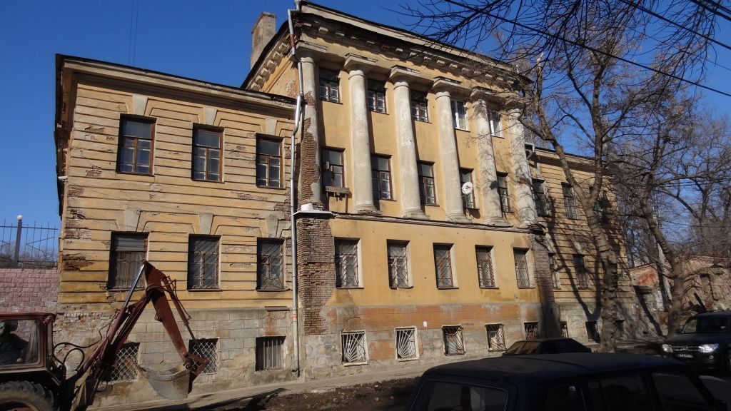 1. Объёмно-пространственное композиционное построение основ-ного объёма здания с фасадами:Здание - характерный памятник гражданской архитектуры Воронежа периода классицизма, в числе аналогов можно назвать дома Тулинова, Сонцова, Мартынова. Кирпичный оштукатуренный объём с широким двусторонним мезонином и высоким цокольным этажом, обращённым из-за перепада рельефа лишь к улице; со двора дом двухэтажный. Боковые дворовые ризалиты придают прямоугольному плану П- образное очертание.В отличие от других аналогичных зданий города этого периода, насыщенным декором отделан не только главный, но и другие фасады.На главном и дворовом фасадах портик с аттиком объединяет второй этаж с мезонином. Средние части главного и торцевых фасадов выделены креповками, остальные плоскости фасадов оформлены линейным рустом. Цокольный этаж главного фасада прорезан небольшими квадратными окнами, обработан квадровым рустом. Выразительны фасады дворовых ризалитов, оформленных в виде портиков с фронтонами.В центре здания лестничная клетка с лестницей, ведущей на верхние этажи.Вход в здание со стороны дворового фасада. 2. Тип материала конструкций стен, крыши, отделки фасадов:Стены здания краснокирпичные, оштукатурены, окрашены с выделением архитектурных декоративных элементов белым цветом. Кровля металлическая. 3. Оконные проёмы цокольного этажа (форма, декоративное оформление, заполнение):Оконные проёмы цокольного этажа (11 шт.) расположены на главном фасаде, по форме близкие к квадрату. На трёх оконных проёмах сохранились подлинные кованые решётки с волнисто-ромбическим раппортом.Оконные заполнения - двойные деревянные двустворные рамы с глухой фрамугой. Плоскость цоколя обработана плоским квадровым рустом.4. Белокаменные детали:Нижняя часть цоколя облицована белокаменными блоками.5. Оконные проёмы первого и второго этажей (форма, декоративное оформление, заполнение):Проёмы первого и второго этажей на боковых частях главного и торцевых фасадов прямоугольного очертания с прямыми клинчатыми перемычками. Большой замковый камень выделен рельефом.Плоскости стен боковых частей фасадов оформлены линейным рустом.Оконные заполнения - двойные деревянные двустворные рамы с глухой фрамугой.6. Центральная часть главного фасада. Портик :В центральной части главного фасада над цокольным этажом возвышается ещё три этажа. Плоскость фасада ритмично разбивается высокими прямоугольными окнами (пять осей). Первый этаж отделён от второго междуэтажным карнизом, на который опирается портик. Трёхчетвертные колонны тосканского ордера, объединяющие третий и четвёртый этажи, несут антаблемент.Заполнение прямоугольных оконных проёмов центральной части - деревянные двойные рамы, двустворные с глухой фрамугой. Створки разделены средниками на три прямоугольные части.Центральная часть главного фасада завершена венчающим карнизом на мутулах и прямым аттиком.7. Фронтон над центральной частью:Центральный портик главного фасада, согласно проекту, был завершён треугольным фронтоном, который в настоящее время утрачен. При выполнении реставрационных работ необходимо воссоздать первоначальный архитектурный облик главного фасада.8. Средняя часть торцевых фасадов:Средняя часть торцевых фасадов (в три оси) выделена креповкой и завершена треугольным фронтоном