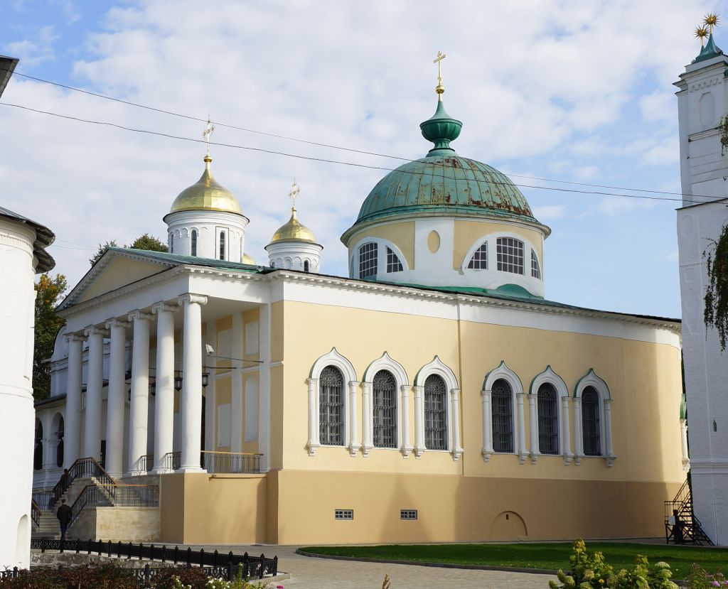 Местоположение в центральной части ансамбля и градостроительные характеристики здания 1617-1618 годы, XVII-XVIII века, 1825-1831 годов – одного из элементов композиционного ядра и архитектурной доминанты монастыря;- Объемно-пространственная композиция объемно-пространственные характеристики кубического с шестиколонным портиком, широким барабаном, перекрытым плоским куполом с главой в форме вазы и открытой папертью-крыльцом здания 1825-1831 годов;- Крыши: двускатная кровля, купол барабана, крест, их конструкция, материал, характер кровельного покрытия (металлическая, окрашенная), в том числе высотные отметки по коньку кровли, зениту купола, главе, кресту; - Композиционное решение и архитектурно-художественное оформление фасадов здания 1825-1831 годов, включая шестиколонный портик ионического ордера, завершенный треугольным фронтоном и карнизом с сухариками, размер, форму, местоположение и оформление оконных и дверных проемов, пилястры, карнизы;- Материал и характер отделки фасадных поверхностей: штукатурка и покраска кирпичных стен;- Характер столярных заполнений дверных и оконных проемов, металлические решетки оконных проемов;Пространственно-планировочная структура здания в пределах капитальных стен, столбов, арочных проемов, цилиндрических сводов подклета и основного объема 1617-1618 годы, XVII-XVIII века, 1825-1831 годов;Капитальные стены, столбы, колонны и перекрытия 1617-1618 годы, XVII-XVIII века, 1825-1831 годов, включая сводчатые перекрытия;Архитектурно-художественное оформление интерьеров, включая изразцовый декор части стен подклета, фрагменты живописи XIX века на сводах северной части и на столбах в центральной части алтаря основного объема.