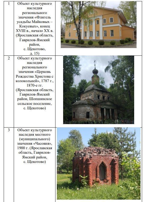 Предметом охраны объекта культурного наследия регионального значения – достопримечательного места «Памятное место. Бывшая усадьба Майковых – Кокуевых», 1787 г., конец XVIII в., конец XIX в., начало ХХ в. (Ярославская область, Гаврилов-Ямский район, Шопшинское сельское поселение, с. Щекотово), являются:- градостроительные характеристики: месторасположение достопримечательного места на территории села Щекотово Шопшинского сельского поселения Ярославского муниципального района Ярославской области;- планировочные характеристики территории достопримечательного места, а именно историческая дорожная сеть;- объекты культурного наследия регионального значения и местного (муниципального) значения (памятники) в составе достопримечательного места:№ п/пУсловное обозначение на схеме предмета охраныНаименование и адрес объекта культурного наследияФотографическое изображение объекта культурного наследия 12341.1-робъект культурного наследия региональ-ного значения «Фли-гель усадьбы Майко-вых – Кокуевых», конец XVIII в., начало ХХ в. (Ярославская область, Гаврилов-Ямский район, Шоп-шинское сельское по-селение, с. Щекотово, д. 15) 2.2-робъект культурного наследия региональ-ного значения «Цер-ковь Рождества Христова с колоколь-ней», 1787 г., 1870-е гг. (Ярославская область, Гаврилов-Ямский район, Шопшинское сельское поселение, с. Щекотово) 3.3-робъект культурного наследия местного (муниципального) зна¬чения «Часовня», 1900 г. (Ярославская об¬ласть, Гаврилов-Ямский район, с. Щекотово) - ценные элементы застройки, а именно: местоположение, историческая объемно-пространственная композиция, историческое архитектурное и конструктивное решения, характер основных строительных и отделочных материалов (дерево), декор фасадов, характер исторических заполнений оконных и дверных проемов:№ п/пНаименованиеценного элемента исторической средыФотографическое изображение ценного элемента исторической среды1231.«Дом священника» 2.«Церковно-приходская школа» - характер архитектурного решения средовой исторической усадебной застройки, а именно: основные строительные и отделочные материалы (дерево), декор лицевых фасадов, представленный резными деревянными наличниками, высотные габариты (фото 1 – 5): Фото 1 Фото 2 Фото 3 Фото 4 Фото 5- ценные элементы благоустройства:№ п/пНаименование и адрес ценного элемента благоустройстваФотографическое изображение ценного элемента благоустройства1231.Могила Майкова К.И. 2.Исторический пруд в центральной части с. Щекотово 3.Исторический пруд вблизи от объекта культурного наследия регионального значения «Флигель усадьбы Майковых – Кокуевых» 4.Пруды на территории базы отдыха «Щекотово» 5.Исторические насаждения на территории базы отдыха «Щекотово» - мемориальное значение достопримечательного места, связанное с жизнью и деятельностью известных ярославских дворян Майковых и купцов Кокуевых.Схема предмета охраны объекта культурного наследия регионального значения – достопримечательного места «Памятное место. Бывшая усадьба Майковых – Кокуевых», 1787 г., конец XVIII в., конец XIX в., начало ХХ в. (Ярославская область, Гаврилов-Ямский район, Шопшинское сельское поселение, с. Щекотово), приведена в приложении к настоящему предмету охраны. Приложениек предмету охраны СХЕМАпредмета охраны объекта культурного наследия регионального значе