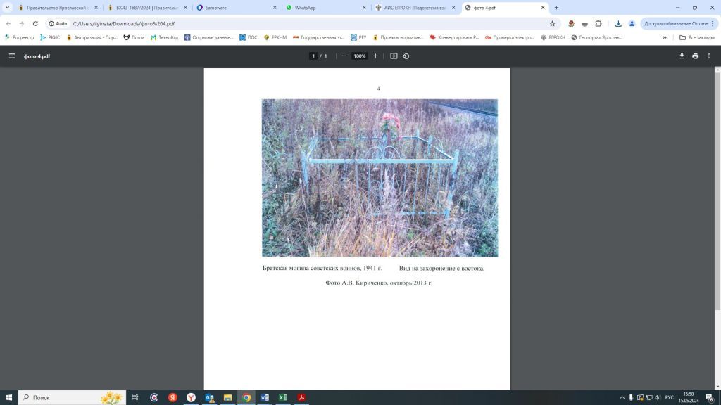 - Существующее месторасположение захоронения относительно железной дороги Сонково - Рыбинск;- захоронение (могила) с останками воинов и сопровождающими захоронение предметами.