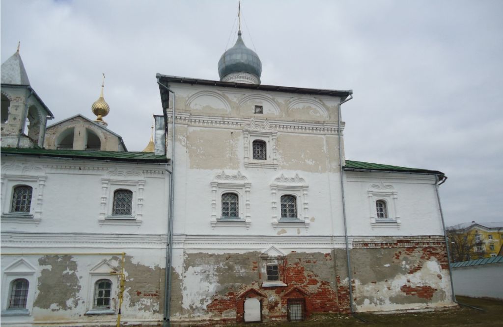 Предметом охраны объекта культурного наследия федерального значения (памятника) «Церковь во имя Смоленской иконы Божией Матери (Одигитрии) с трапезной и отдаточной палатой», 1674 – 1677 гг. (Ярославская область, г. Углич, Спасская ул., д. 31/2а), в составе объекта культурного наследия федерального значения (ансамбля) «Ансамбль Воскресенского монастыря», XVII в., являются:- местоположение и градостроительная роль памятника, его участие в формировании основных городских панорам западной части Углича, правого берега р. Волги, роль в структуре ансамбля;- сложная объемно-пространственная структура расположенных на одной оси восток – запад на высоких подклетах: прямоугольной в плане одноглавой бесстолпной церкви с подвалом под подклетом четверика, перекрытой на четыре ската, с трехчастной апсидой со скатным покрытием; с прямоугольной одностолпной трапезной палатой, с двухскатным покрытием, увенчанной в западной части сквозным ярусом часозвона, перекрытого шатром; с примыкающей к северному фасаду трапезной и частично к церкви квадратной в плане папертью (сени) и прямоугольной, вытянутой по оси восток – запад, отдаточной (келарской) палатой, покрытыми единой кровлей на один скат;- капитальные стены, сложенные из красного полнотелого глиняного большемерного кирпича, в том числе лекального, включающие: крестовые своды с длинными килевидными распалубками над окнами и дверными проемами отдаточной палаты и подклета; лотковый свод с распалубками четверика; коробовый свод с длинными килевидными распалубками над окнами и дверями алтаря, коробовый свод с распалубками над входами; цилиндрический свод с распалубками над дверью и окнами отдаточной палаты; цилиндрический свод с распалубкой над дверью подклета четверика; коробовый свод с длинными распалубками между внутристенных, слегка выступающих столбов на восточной и западной стенах, а также над окнамивосточных полукружий подклета алтаря; коробовые своды с килевидными распалубками над дверными и оконными проемами подклета и отдаточной палаты и паперти; цилиндрический свод подвала под подклетом четверика; коробовый свод палатки часозвона; исторические форма и габариты крыши: четверика, апсид и галереи; угол уклона скатов; материал кровельного покрытия – фальцованный металл; характер покрытия шатра часозвона косой металлической шашкой;- рельефно выделенный цоколь с раскрепованным поясом из тесаного кирпича в виде полувала над ним;- архитектурно-художественное оформление фасадов: широкие лопатки – угловые и в местах примыкания капитальных стен; лопатки между апсидами алтаря; развитый раскрепованный многоступенчатый междуэтажный пояс с поребриком, отделяющий подклет от основного этажа; раскрепованный профилированный карниз с двухступенчатыми зубчиками, над которым расположен ряд ложных закомар, трехуступчатый венчающий карниз высокого двухсветного четверика; профилированный с поребриком венчающий карниз алтаря и отдаточной палаты; раскрепованный многоступенчатый с двухступенчатыми зубчиками, венчающий на южном фасаде, карниз и двухуступчатый венчающий карниз скатов западного фасада трапезной палаты; форма, габариты исторических арочных оконных проемов, оформление окон основного этажа, а также окон верхнего света четверика церкви наличниками «узорочного» стиля с пр