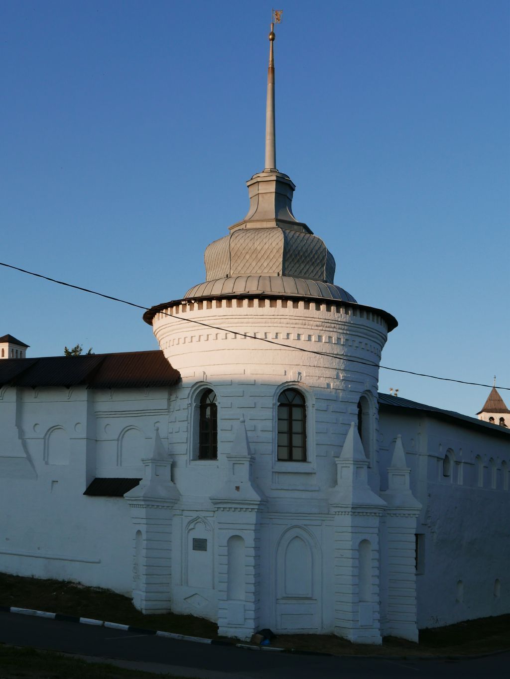 Градостроительные характеристики cооружения:-Местоположение у пересечения западной и южной стен и градостроительные характеристики сооружения 1623, 1804 годов – одного из элементов ограды ансамбля монастыря;Архитектурные характеристики и конструктивные элементы объекта:-Объемно-пространственная композиция двухъярусной круглой башни с двухэтажной пристройкой, в том числе высотные отметки по венчающему карнизу;- Крыши: фигурная крыша барочной формы башни и скатная крыша с двумя слуховыми окнами со стороны монастыря пристройки, конструкция, материал, характер кровельного покрытия, в том числе высотные отметки по зениту кровли и шпилю башни, коньку и верху слуховых окон пристройки;-Композиционное решение и архитектурно-художественное оформление фасадов сооружения 1804 года, включая размер, форму, местоположение и форма ниш, руста, пилястр и горизонтальных тяг, пинакли, ступенчатый карниз с сухариками;-Материал и характер отделки фасадных поверхностей: известковая обмазка стен, стены пристройки штукатурка и покраска; - Характер столярных заполнений дверных и оконных проемов;Пространственно-планировочная структура cооружения в пределах капитальных стен, сводов и плоских перекрытий 1623, 1804 годов;Капитальные стены и перекрытия 1623, 1804 годов.