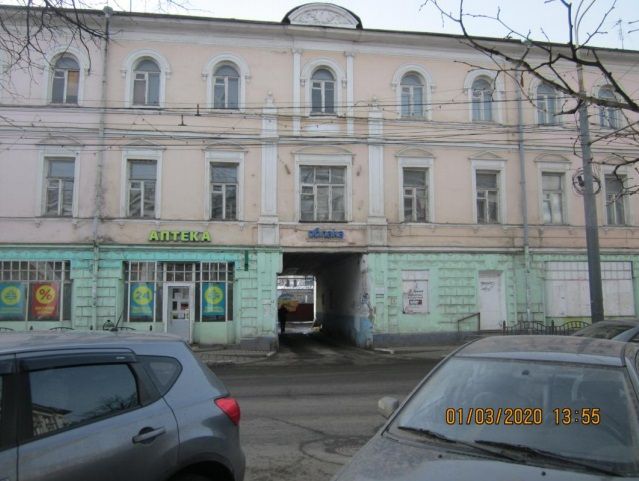 композиционные особенности здания, участвующего в формировании сплошной застройки красной линии Комсомольской улицы;объёмно-пространственная композиция трёхэтажного основного объёма, близкого в плане к параллелепипеду, вытянутого по оси север-юг, со сквозным прямоугольным проездом в центре, с двумя симметрично расположенными трёхэтажными дворовыми пристройками: северной, близкой в плане к квадрату, и южной, прямоугольной в плане, вытянутой по оси восток-запад, с расположенной между пристройками двухэтажной галереей; габариты, высотные отметки по коньку, скатная форма крыш основного объёма и пристроек; скатная форма крыши галереи; полуциркульный фронтон па центральной оси лицевого (восточного) фасада основного объёма;количество, габариты, конфигурация и осевое расположение оконных и дверных проёмов на фасадах: прямоугольные горизонтального расположения витринные оконные проёмы первого этажа лицевого (восточного) фасада с эркерным оформлением и «смягчёнными», стёсанными от верхней четверти вниз откосами; прямоугольная форма оконного проёма на лицевом (восточном) фасаде; прямоугольная форма оконных проёмов первого этажа дворового (западного) фасада основного объёма, второго этажа фасадов основного объёма и южной пристройки; прямоугольная, близкая к квадрату форма центрального окна второго этажа лицевого фасада; полуциркульное завершение прямоугольных окон третьего этажа фасадов основного объёма и южной пристройки, а также первоначальных оконных проёмов первого этажа галереи (целесообразно восстановить при проведении научной реставрации), западных фасадов пристроек; дверные проёмы, заглублённые в прямоугольные ниши, в южной и северной стенах проезда, расположенные под галереей; прямоугольный дверной проём на лицевом (восточном) фасаде; прямоугольная форма сдвоенных окон второго этажа галереи; материал и характер столярных заполнений оконных проёмов, в том числе дробная многочастная расстекловка окон галереи и витринных окон лицевого фасада; полуциркульные слуховые проёмы в тимпанах дворовых пристроек;материал капитальных стен - красный глиняный кирпич; материал второго яруса галереи - дерево; материал кровли - металл;композиционное решение и архитектурно-художественное оформление фасадов: лицевого (восточного) фасада основного объёма: рельефно выступающий кирпичный цоколь; «бриллиантовый» руст первого этажа; узкие рамочные наличники витринных проёмов первого этажа; фланкирующие проезд филёнчатые пилоны со стёсанными от верхней четверти вниз углами, обращёнными к проезду, завершённые стилизованной абакой; простой междуэтажный карниз между вторым и третьим этажами; профилированный подоконный пояс второго этажа; рамочные штукатурные мелкопрофилированные наличники окон второго этажа с «гирьками», состоящими из прямоугольной пластины с обломом и полушария, и завершением в форме треугольных и лучковых сандриков; филёнчатые пилястры на филёнчатых базах, выделяющие центральную ось фасада на уровне второго этажа и нижней части (до подоконного пояса) третьего этажа, завершённые гипсовыми пинаклями; профилированные междуэтажный и подоконный пояса между вторым и третьим этажами; прямоугольная горизонтальная филёнка на центральной оси фасада под окном третьего этажа, фланкированная короткими 