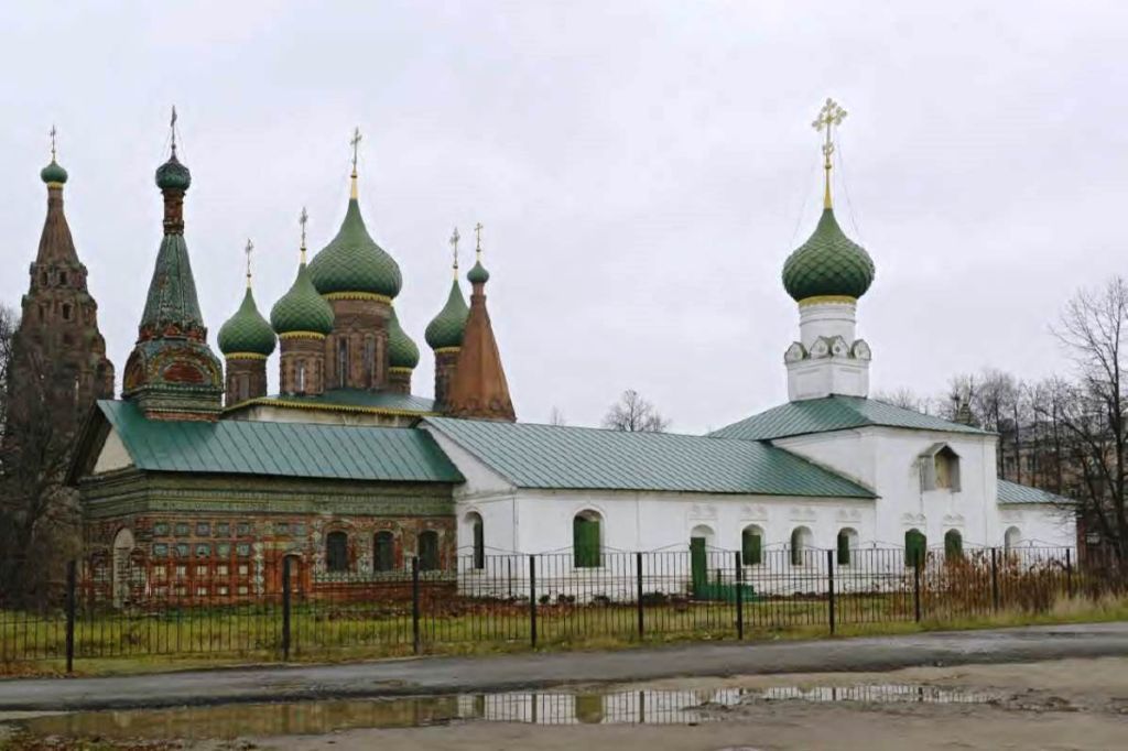 Предметом охраны объекта культурного наследия федерального значения «Церковь Тихвинской Божьей Матери», 1686 г. (г. Ярославль, ул. Чайковского, д. 1), являются: - местоположение и градостроительные характеристики здания, являющегося градостроительной доминантой, участвующего в формировании городских панорам и видов;- объёмно-пространственная продольно-осевая композиция трёхглавой церкви, ориентированной с запада на восток, включающей исторический объём шатрового крыльца-притвора с частично сохранившейся каменной оградой, крытую галерею, трапезную с папертью, повышенный объём односветного четверика, прямоугольную алтарную часть, придел св. Василия Великого с северной стороны с притвором к нему;- материал стен – красный керамический кирпич; характер обработки фасадной поверхности стен – известковая обмазка по кирпичу (кроме галереи и крыльца); историческое колористическое решение поверхности стен и элементов декора – белый цвет (кроме галереи и крыльца);- лицевая кирпичная кладка и богатое убранство из поливной полихромной, в том числе профилированной, керамики галереи и крыльца; форма, местоположение, оформление изразцовых элементов притвора;- крыши, барабаны и купола храма, их форма и конструкции, в том числе:четырехскатная крыша четверика, увенчанная луковичной главкой на глухом цилиндрическом барабане, декорированном поясками валиками и поребриком, и кубическом постаменте, декорированном угловыми лопатками, поребриком и трехлопастными килевидными кокошниками с поливными изразцами в тимпане;двускатные крыши трапезной с папертью;Г-образная крыша западного крыльца и галереи, увенчанная шатром на постаменте, с маленькой луковичной главкой на вытянутой шее;трёхскатная крыша алтаря и придела, увенчанная двумя небольшими луковичными главами на высоких цилиндрических шеях с перетяжками;скатная крыша северного притвора; характер исторического кровельного покрытия – металлический лист на фальцевом соединении;- композиционное решение и архитектурно художественное оформление фасадов храма, включая вертикальное и горизонтальное членение фасадов: рельефно выделенный цоколь, огибающие лопатки, цокольный и венчающий профилированные карнизы с рядом поребрика, обрамленного валиками; венчающий карниз с рядом поребрика, обрамленного валиками на барабанах всех глав; - композиционное решение и архитектурно-художественное оформление галереи, крыльца и шатра над ним: ряды ширинок с квадратными и ромбическими нишами, в центре заполненными изразцами; профилированные горизонтальные пояски; оформление архивольтов в виде профилированных карнизов с поребриком; вертикальные рёбра жесткости шатра, оформление четверика шатра профилированными поясками; - местоположение, форма, размер, декор оконных и дверных проёмов трапезной, паперти, четверика, апсиды, галереи и крыльца лучковой формы в арочных нишах с откосами, декоративные обрамления – валики оконных проёмов, килевидные профилированные кокошники наличников оконных проёмов, «травная» роспись откосов трёх окон в лучковой части (окно паперти на западном фасаде с южной стороны, окно трапезной на южном фасаде ближнее к четверику, окно апсиды на восточном фасаде крайнее левое);- пространственно-планировочная структура интерьеров в пределах капитальных стен, опор и сво