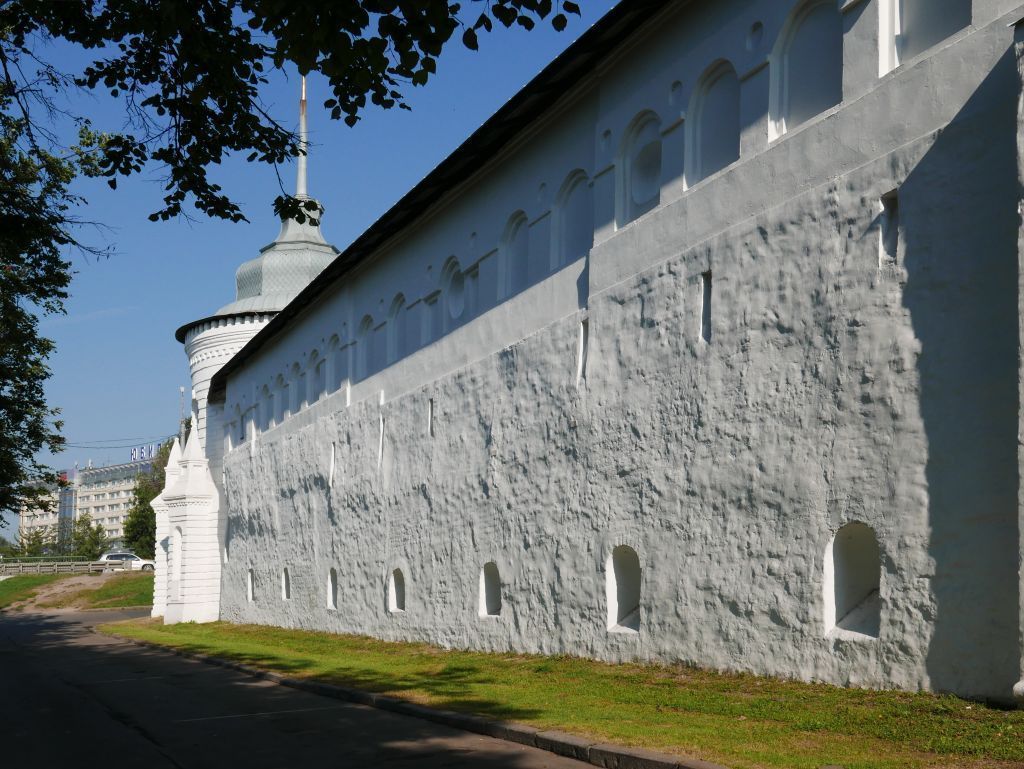 Градостроительные характеристики cооружения:- Местоположение и градостроительные характеристики оборонного сооружения – элемента южной части ансамбля монастыря.Архитектурные характеристики и конструктивные элементы объекта:- Объемно-пространственная композиция XVII, XIX веков двухярусного, завершенного односкатной кровлей, сооружения вытянутого с северо-востока на юго-запад. Высотные отметки по верху и низу кровли, уровню пола прохода по верхнему уровню;- Крыша, ее конфигурация, конструкция, материал, характер кровельного покрытия, в том числе высотные отметки, материал кровельного покрытия;- Композиционное решение и архитектурно-художественное оформление фасадов сооружения XVII, XIХ веков, включая размер, форму, местоположение и оформление, арочных бойниц, круглых проемов в верхней части стены, аркады боевого хода по стене и арочные ниши-печуры со стороны монастыря;- Материал и характер отделки фасадных поверхностей: кирпичная кладки стен, ряд декоративных ниш верхнего яруса;- Колористическое решение фасадов – известковая обмазка белого цвета;- Капитальные стены XVII, XIХ веков.