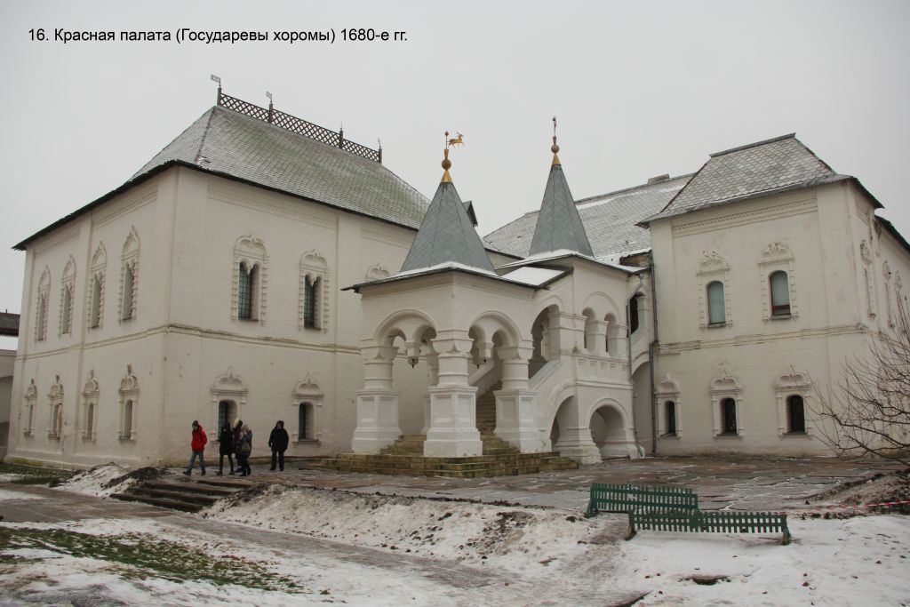 Предметом охраны объекта культурного наследия федерального значения «Красная палата (Государевы хоромы)», 1680-е гг. (Ярославская обл., г. Ростов, Кремль (лит. Ю)), в составе объекта культурного наследия федерального значения «Ансамбль Ростовского Кремля», XII – XVI, XVII – XX вв. (Ярославская область г. Ростов, Кремль; Советский пер., д. 1, д. 3/2, ул. 50 лет Октября, д. 2/3, д. 2; ул. Каменный Мост, д. 1; пл. Соборная, д. 8; ул. Карла Маркса, д. 25а), являются: - местоположение, композиционные особенности памятника, участвующего в формировании объёмно-пространственной композиции ансамбля Ростовского кремля и фронта застройки парадного центрального двора ансамбля;- историческая объемно-пространственная композиция г-образного в плане, двухэтажного здания (второй этаж частично восстановлен при реставрации 1950 – 1960-х гг.), состоящего из двух расположенных под углом объёмов: юго-восточного (с одностолпной палатой) и западного («хором»), завершённого на северо-востоке повышенным ризалитом, с галереей между ризалитом и юго-восточным объёмом; с высоким двухрундучным крыльцом с лестницей на «ползучих» арках (восстановленным при реставрации 1950 – 1960-х гг.) с двумя восьмигранными шатрами с полицами; объёмы перекрыты тремя высокими вальмовыми крышами с полицами (восстановленными при реставрации 1950 – 1960-х гг.), крыша юго-восточного объёма – с гребнем, с четырьмя слуховыми окнами с высокими треугольными фронтонами и дымником на южном скате; крыша западного объёма – с подобными слуховыми окнами: тремя на южном и пятью – на западном скатах; характер покрытия крыши и крыльца уточняется методами научной реставрации; к зданию примыкают: на западном фасаде – переход на крепостную стену и на южном фасаде – две арочные перемычки, соединяющие памятник с западным пряслом южной крепостной стены (восстановленные при реставрации 1950 – 1960-х гг.);- местоположение, габариты, конфигурация первоначальных и восстановленных при реставрации 1950 – 1960-х гг. прямоугольных с двухлопастными арочными перемычками с гирькой в пяте оконных проемов второго этажа северного и восточного фасадов юго-восточного объёма (с одностолпной палатой); прямоугольных с арочными перемычками оконных и дверных проемов;- архитектурно-художественное оформление фасадов (восстановленное при реставрации 1950 – 1960-х гг.), в том числе рельефно выделенный двухуступчатый кирпичный цоколь с верхней частью в плоскости лопаток; широкие раскрепованные междуэтажным поясом лопатки; раскрепованный междуэтажный пояс поребрика, ограниченного валиками, подчёркнутый узкой заглубленной нишей;- архитектурно-художественное оформление северного и восточного фасадов юго-восточного объёма (одностолпной палаты), в том числе широкий профилированный венчающий карниз с поясом «бегунца», «разорванный» лопатками; оформление наличников оконных проёмов: на первом этаже – с боковинами, решёнными в виде тонких пятигранных полуколонн с перехватами-полуваликами, отделяющими верхний и нижний отрезки ствола, с выгнутыми профилированными сандриками с «килями», с профилированными карнизами, раскреповки которых образуют капители боковин; с профилированными подоконниками, раскрепованными на вертикалях боковин, с трёхгранными серьгами по оси боковин (вид 1); на втором этаже – в виде наборных колонок из чередующихся по вертикали квадров 