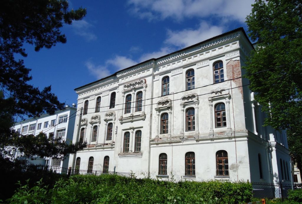 Особенности здания, участвующего в формировании красных линий Революционной улицы и Волжской набережной, а также панорамы правого берега р. Волги;объёмно-пространственная композиция прямоугольного в плане трёхэтажного с подвалом здания с плоскими ризалитами на центральных осях всех фасадов, повышенным над восточным фасадом, и примыкающей к восточному фасаду кованой решёткой ограды; четырёхскатная форма, габариты и высотные отметки по коньку прямой пальмовой крыши основного объёма; четырёхскатная форма, габариты прямой пальмовой крыши над ризалитом восточного фасада и повышенной центральной частью восточного ската крыши основного объёма (целесообразно восстановить при проведении научной реставрации); узкий цилиндрический глухой барабан над ризалитом восточного фасада и повышенной центральной частью восточного ската крыши основного объёма, увенчанный луковичной главкой, покрытой объёмной шашкой (пирамидкой), с «яблоком» и восьмиконечным крестом (целесообразно восстановить при проведении научной реставрации);местоположение, габариты, конфигурация и оформление дверных и оконных проёмов здания: осевое расположение оконных проёмов на фасадах основного объёма, сдвоенные окна южного ризалита, размещённые в два яруса на уровне промежуточных площадок внутренней лестницы, строенные окна на всех этажах западного ризалита, крупное окно третьего этажа восточного ризалита, три небольших полуциркульных окна третьего этажа северного ризалита прямоугольная форма с арочной двуцентровой перемычкой оконных проёмов, прямоугольная форма с арочной перемычкой крупного оконного Проёма ризалита на северном фасаде, прямоугольная форма с арочной перемычкой дверных проёмов на центральной оси северного фасада и на южной оси западного фасада; характер столярных заполнений оконных и дверных проёмов: восьмичастная расстекловка окон основного объёма, двенадцатичастная расстекловка окна ризалита северного фасада, полуциркульная световая фрамуга и деревянное филёнчатое дверное полотно входа на северном фасаде с крупными четырёхгранными вставками и фланкирующими раскрепованными полуколонками (левую необходимо восстановить при проведении научной реставрации);материал капитальных стен - красный глиняный кирпич; материал кровли - металл;композиция и архитектурно-художественное оформление фасадов, сложившееся в 1901 г., включая кирпичный рельефно выделенный цоколь по пери метру здания; раскренованныйми о ступенчатый профилированный карниз между первым и вторым этажами по периметру здания; развитый антаблемент, включающий в себя три части: архитрав с декоративным пояском в виде цепочки ромбиков, фриз с глубокими ширинками и уступчатый карниз с сухариками; наличники окон второго этажа основного объёма в виде полуколонок с капителями-дыньками и килевидными кокошниками в завершении; прямоугольные заглубления, в которые помещены окна основного объёма третьего этажа; декоративное убранство восточного ризалита: угловые пилястры на уровне второго и третьего этажей, отделанные профилированными ширинками и завершённые циркульными кокошниками, оформление крупного окна третьего этажа, верхняя часть которого представлена в виде трёхпролётной «висячей» аркады с двумя гирьками, подчеркнутой архивольтами и объединённой свер