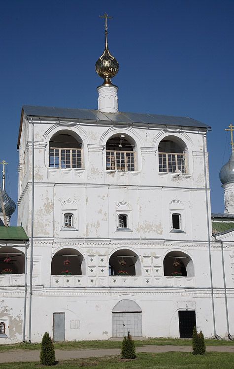 Предметом охраны объекта культурного наследия федерального значения (памятника) «Звонница с церковью во имя преподобной Марии Египетской», 1677 г. (Ярославская область, г. Углич, Спасская ул., д. 31/2а), в составе объекта культурного наследия федерального значения (ансамбля) «Ансамбль Воскресенского монастыря», XVII в., являются:- местоположение и градостроительная роль памятника, его участие в формировании основных городских панорам западной части Углича, правого берега р. Волги, роль в структуре ансамбля;- объемно-пространственная структура симметричного трехпролетного четырехъярусного (первый нижний ярус – подклет, второй – галерея-паперть, третий – церковь Марии Египетской, четвертый – ярус звона) прямоугольного, вытянутого по оси север – юг, объема со сквозным арочным проездом, перекрытого на два ската, увенчанного луковичной главой на высоком глухом барабане, примыкающего в уровне галереи и подклета с севера к галерее собора, с юга – к паперти трапезной палаты Смоленской церкви;- капитальные стены, сложенные из красного полнотелого глиняного большемерного кирпича, в том числе лекального, включающие: коробовые своды пролетов подклета, галереи (с длинными килевидными встречными распалубками над открытыми арочными проемами), помещения церкви Марии Египетской (с распалубками над окнами) и галереи звона; исторические углы уклона скатов крыши; материал кровельного покрытия – фальцованный металл; конфигурация, габариты, характер покрытия главы – косая металлическая шашка-чешуйки;- рельефно выделенный цоколь с раскрепованным поясом из тесаного кирпича в виде полувала над ним на западном и восточном фасадах;- архитектурно-художественное оформление фасадов: на западном и восточном – широкие лопатки в продолжении простенков галереи в уровне третьего яруса, меньшие по ширине в уровне четвертого яруса,раскрепованные междуэтажными поясами, завершенные профилированными с поребриком импостами, над которыми расположен ряд профилированных архивольтов галереи звона; междуэтажные пояса: профилированный с поребриком (урезанным над центральным арочным проездом), отделяющий подклет от галереи, раскрепованный профилированный с трехступенчатыми зубчиками пояс между галереей и ярусом церкви, раскрепованный трехуступчатый, отделяющий ярус звона – по всему периметру; двухуступчатый венчающий карниз, заходящий на торцы; широкие арочные проемы (в том числе заложенные) подклета, галереи и яруса звона, на торцевых фасадах в уровне яруса звона – доходящие до конька и разделенные по центру столбами квадратного сечения; трехуступчатое с килевидным завершением обрамление торцевых арочных проемов; лекальные окантующие пояски-валики из тесаного кирпича, заходящие на пояс поребрика, над перемычками арок галереи; местоположение, форма, габариты исторических арочных оконных проемов церкви, оформление окон рамочными наличниками, завершающимися килевидным очельем на западном фасаде и сдвоенными треугольными фронтонами на восточном фасаде; профилированные прямоугольные ширинки с поставленными «на угол» муравлеными изразцами парапета и простенков галереи и парапета галереи звона; оформление барабана главы аркатурным поясом с перетяжками на вертикальных тягах, с чередованием завершений арок гирьками и профилированными поясами;- 