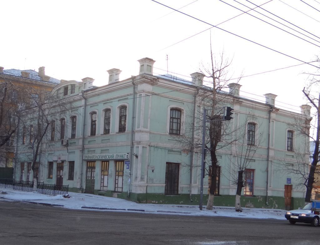 I. Градостроительные характеристики.1.1. Местоположение. В окружении исторической застройки, на пересечении улиц Амурская и 9 Января. Северо-восточный фасад фиксирует историческую линию застройки ул. Амурская, северо-западный - ул.9 Января.1.2. Габариты, силуэт. Двухэтажное здание. Размеры Г-образного в плане объема 22.0 х 26.6 х 15.8м. Силуэт создан лучковым с плечиками парапетом по оси северо-восточного фасада и парапетными столбиками.1.3. Композиционная значимость: Опорный элемент градостроительного каркаса, формирует нанорамы исторической застройки улиц Амурская и 9 Января.II. Архитектурные и конструктивные характеристики.II.1. Объемно-пространственная композиция. Двухэтажное здание с Г-образным планом, составленным основным объемом и пристроем на левом фланге юго-западного фасада. Под средней частью здания расположен Т-образный в плане подвал. На северо-восточном фасаде три исторических проема входов. В пристрое входы расположены на северо-западном и юго-восточном фасадах.II.2. Крыша. Основной прямоугольный объем здания под вальмовой кровлей. Объем пристроя под односкатной кровлей. Водосток с настенными желобами и водосточными трубами.II.2.1. Фронтон. Над средней частью северо-восточного фасада лучковый фронтон с плечиками, с тремя чердачными окнами и 2-мя небольшими нитками, фланкирован парапетными столбиками. В крайних проемах установлены остекленные рамы, в среднем - деревянная жа-люзийная решетка. Криволинейное очертание парапета подчеркнуто ступенчатым карнизом, профиль которого составлен из двух прямоугольных ступеней с четвертным валиком между ними.II.2.2. Парапетные столбики. Лопатки на уличных фасадах завершены столбиками с профилированным карнизом и нишкой на лицевой грани. На северо-восточном фасаде столбики установлены и в середине пролетов.II.2.3. Парапетное ограждение. Металлическое, выполнено из двух горизонтальных полос между столбиками, объединенных в середине пролетов тремя вертикальными стойками с пикообразными завершениями.II.3. Композиция и архитектурно-художественное оформление фасадов.II.3.1. Венчающий карниз основного объема и северо-западной стены пристроя, раскрепо-ван лопатками, имеет ступенчатый профиль с четвертным валом.II.3.2. Фриз завершает стены основного объема и северо-западный фасад пристроя. Профилированный нижний пояс фриза раскрепован лопатками.II.3.3. Подоконный карниз. Карниз 2-го этажа расположен на северо-западном фасаде пристроя и основном объеме. Карниз 1-го этажа расположен на северо-западном, юго-западном и юго-восточном фасаде основного объема. Карнизы, со ступенчатым с выкружкой профилем, раскрепованы лопатками.II.3.4. Междуэтажный пояс. Огибает основной объем и северо-западный фасад пристроя Пояс, раскрепованный лопатками, имеет ступенчатый профиль.II.3.5. Нишки. На северо-восточном и северо-западном фасадах над проемами имеются прямоугольные нишки. Такие же нишки устроены в плоскости между подоконным и межэтажным карнизами на северо-западном фасаде и симметрично над 6 проемами на северо-восточном фасаде.II. 3.6. Лопатки. Северо-западный, северо-восточный и юго-восточный фасады расчленены лопатками. Карнизы делят лопатки в ритме пилястр 1-го и 2-го этажей с прямоугольными филенками.II.4. Отделка фасадов. Кирпичная кладка стен и цоколя с гладкой штукатуркой.II.5. Заполнение дверных и оконных пр