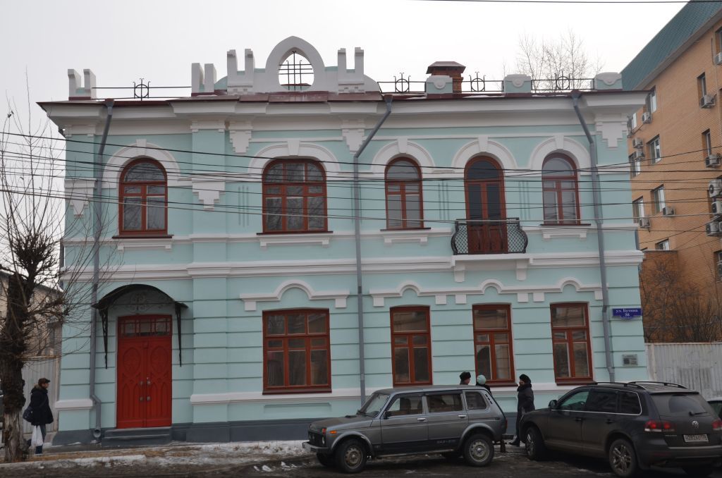 Объемно-пространственная и планировочная композиция здания: двухэтажное кирпичное здание в стиле эклектики с использованием элементов модерна, П-образное в плане под вальмовой кровлей (габариты здания: 20.5x15.2 м), состоящее из основного объема, главный северо-западный фасад которого фиксирует историческую красную линию застройки ул. Бутина, и двух объемов, расположенных на флангах северо-восточного фасада; лестничный блок с парадным входом в объеме на правом фланге, расположенном со смещением от красной линии застройки улицы, и два дворовых входа, расположенных на юго-восточном фасаде основного объема. Силуэт постройки, сформированный ассиметрично расположенным криволинейным фронтоном, парапетными столбиками двух типов и металлическим ограждением. Композиция и архитектурно-художественное оформление фасадов: отделка главного фасада гладкой штукатуркой. Фронтон сложнофигурного очертания в уровне кровли, по оси левого проема основного объема, со средней частью стрельчатой формы с овальным проемом и металлической решеткой, фланкированной парапетной стенкой со ступенчатой верхней плоскостью. Прямоугольные выступы в середине парапетной стенки, завершенные карнизом с сухариками и увенчанные 2 узкими вертикальными стойками со ступенчатым карнизом на лицевой грани. Правый фланг парапетной стены полукруглой формы; левый фланг, расположенный над углом основного объема, с двумя вертикальными выступами, объединенными в нижней части. Парапетные столбики, прямоугольные в плане, на правом фланге, в верхней части лицевой грани, которых выступ с полукруглым свесом, декорированным рельефным кругом; парапетные столбики левого фланга в виде двух вертикальных стоек, объединенных в нижней части ступенчатой стенкой. Металлическая кованая парапетная решетка в виде двух горизонтальных полос, объединенных по центру тремя вертикальными стойками и кольцом. Профилированный венчающий карниз значительного выноса, раскрепованный лопатками и свесами по флангам фронтона, на главном фасаде, ступенчатый венчающий карниз на дворовых фасадах. Завершающий стену северо-западного фасада выступ прямоугольного сечения, раскрепованный лопатками и свесами по флангам фронтона; на основном объеме, под флангами фронтона, ступенчатые свесы, разрывающие выступ прямоугольного сечения, в уровне верха замковых элементов. Подоконные пояса, огибающие здание по периметру: на главном фасаде - профилированные оштукатуренные, раскрепованные лопатками, на дворовом - кирпичные с применением отесанного кирпича. Междуэтажный пояс, огибающий здание по периметру: на главном фасаде - оштукатуренный, раскрепованный лопатками, с многообломным профилем, на дворовых фасадах - ступенчатого профиля. Межоконный пояс на главном фасаде, объединяющий обрамление оконных проемов 2-го этажа в уровне фрамуг, оштукатуренный, с профилированным карнизом, раскрепованный лопатками. Нишки в подоконье первого этажа, прямоугольные со ступенчатым углублением и скошенными углами. Простенки первого этажа главного фасада со штукатурным рустом; в простенках второго этажа на главном фасаде основного объема по три вертикальных полукруглых желобка. Лопатки на углах основного объема и лестничного блока главного фасада, раскреповывающие карнизы; в уровне фриза - два прямоугольных кр