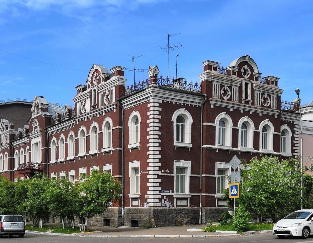 Объемно-пространственная и планировочная композиция здания: 2-х этажное здание, размеры прямоугольного плана 51,09x18,07 м, фиксирует ризалитами юго-восточного и северо-восточного фасадов исторические красные линии ул. Профсоюзная и ул. Анохина.Силуэт сформирован парапетными завершениями ризалитов, парапетными столбиками и металлической кованой решеткой.Двухэтажное капитальное здание с подвальными помещениями, прямоугольное в плане. Композиция главного и торцевого фасада составлена чередованием ризалитов и западающих плоскостей стен. По оси юго-восточного фасада ризалит парадного входа. На флангах юго-восточного фасада, со смещением к центру на 1 оконный проем, и по оси северо-восточного выполнены ризалиты с одинаковым оформлением на 3 оконных проема. Парадная лестница по оси объема, объединяет все этажи. Второй лестничный блок, объединяющий 1 и 2-й этажи, расположен в западной части здания и имеет выход на северо-западном фасаде. Подвальные помещения имеют дополнительные выходы в приямках на северо-западном фасаде.Строительные конструкции: материал стен - неоштукатуренный кирпич.Композиция и архитектурно-художественное оформление фасадов: парапетные столбики над простенками юго-восточного фасада и углами, прямоугольные в сечении, с вертикальной нишей на лицевой плоскости, с рустованными углами и ступенчатым карнизом с «сухариками» на лицевой плоскости, на лицевой плоскости - двускатное завершение с металлическим покрытием и профилированным фронтоном; угловой восточный столбик имеет крестовое покрытие с двумя фронтонами. Парапетная решетка металлическая, кованая с криволинейным рисунком на юго-восточном и северо-восточном фасадах, объединяет парапетные столбики и фронтоны ризалитов.Венчающий карниз завершает стены 3-х фасадов, ступенчатого профиля с использованием лекального кирпича, поддержан рядом ступенчатых кронштейнов, разорван ризалитами. Фриз на 3-х фасадах, узкий, ленточный, прямоугольного сечения, разорван ризалитами.Подоконный пояс 1-го этажа - прямоугольного профиля на юго-восточном и северо-восточном фасадах разорван на западающих плоскостях флангов юго-восточного фасада и на ризалите парадного входа, подоконный пояс 2-го этажа - трапециевидного профиля, на 3-х фасадах, разорван на флангах северо-восточного и юго-восточного фасадов.Межоконные пояса на юго-восточном и северо-восточном фасадах в уровне фрамуг, объединяют наличники проемов 1-го и 2-го этажей. Пояса разорваны: на 1-м этаже - на западающих плоскостях флангов юго-восточного фасада и на ризалите парадного входа, на 2-м этаже - на флангах северо-восточного и юго-восточного фасадов.Углы главных фасадов выделены рустованной кладкой. Цоколь на главных фасадах оштукатуренный под «шубу», с рустовкой на юго-восточном и северо-восточном фасадах.Прямоугольный проем Парадного входа имеет П-образное остекленное обрамление со скругленными углами и оригинальной расстекловкой. Над проемом рама 6-ти стекольная, в скругленных верхних углах рама декорирована накладными элементами в виде четверти кольца с радиальными лучами, по бокам от проема криволинейная расстекловка рам с витражным цветным заполнением, в скругленных нижних углах рамы с криволинейной расстекловкой. Проем входа с двупольными деревянными филенчатыми дверьми и 2-х стекольной фрамуго