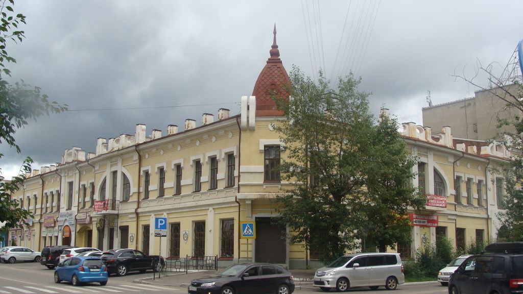 1. Градостроительные характеристики:1.1. Местоположение. Угловое здание фиксирует исторические линии застройки улицы Чайковского главным юго-западным фасадом, улицы Журавлева главным северо- западным фасадом.1.2. Габариты. Двух-трех этажный кирпичный дом со скошенным углом. Размеры в плане: длина объема по ул. Чайковского - 51,42 м, длина объем по ул. Журавлева - 53,43 м., длина дворового крыла - 16,97 м.1.3. Силуэт. Создается переменной этажностью, криволинейными завершениями в уровне кровли ризалитов и левого фланга 3-х этажного объема, парапетными столбиками и куполом.2. Архитектурные и конструктивные характеристики:2.1. Объемно-пространственная композиция. Здание с подвальными помещениями состоит из двух объемов, 3-х этажного и 2-х этажного, имеет общий П-образный план с небольшим крылом, развитым вглубь квартала, со ступенчатым планом дворовых фасадов. На ассиметричных главных фасадах со скошенным западным углом, выделены ризалиты лестничных клеток с входами и центральные ризалиты с криволинейными проемами и балконами. В средней части объема по улице Журавлева предусмотрена арка проезда Конструктивная схема объема по ул. Чайковского с продольными несущими стенами, объем по ул. Журавлева с поперечными несущими стенами. Входы в подвал предусмотрены на дворовых фасадах.2.2. Крыши. Двускатные, с вальмой над углом двухэтажного объема. Кровля металлическая с фальцевым соединение картин. Водосток организован настенными желобами и водосточными трубами.2.2.1. Купол. Четырехгранный криволинейный с чешуйчатым металлическим покрытием акцентирует скошенный угол. Грани купола декорированы овальным элементом по типу люкарны с рельефом в виде звезды на лицевой грани. Фигурное завершение купола венчает резной шпиль.2.3. Парапетное ограждение.2.3.1. 3-х этажный объем. Левый фланг объема венчает парапетное ограждение аналогичное завершению ризалита. Парапетные ограждения флангов и парапетные столбики со ступенчатыми завершениями и криволинейными лицевыми гранями объединены тремя горизонтальными металлическими связями.2.3.2. 2-х этажный объем. Простенки двухэтажного объема в уровне кровле завершены парапетными столбиками, выступ на лицевой плоскости с полукруглым свесом.2.4. Композиция и архитектурно-художественное оформление фасадов.2.4.1. Ризалиты.2.4.1.1. Ризалит трехэтажного объема. Расположен на правом фланге. Углы ризалита фланкированы лопатками. Рамочные обрамления прямоугольных оконных проемов объединены вертикальными выступами в уровне 2-3 этажей. Завершение в уровне кровли - парапетные столбики, объединенные парапетной стенкой криволинейного очертания с двумя горизонтальными выступами и большим овальным отверстием. Проем входа с подковообразным завершением с прямоугольной остекленной дверью и криволинейными боковыми рамами и фрамугой.2.4.1.2 Угловой ризалит. Увенчан куполом. Эркер второго этажа поддержан двумя криволинейными кронштейнами. Под эркером предусмотрен вход. Стены ризалита в уровне первого этажа рустованные. Эркер по вертикали разделен подоконным и межоконным поясами. Лицевая плоскость эркера завершена профилированным карнизом с четвертным валиком. Фланги ризалита в уровне фриза и кровли декорированы парами вертикальных выступов с закругленными лицевыми плоскостями.2.4.1.3. Ризалиты лестничных клеток. Входные проемы с под