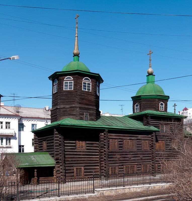 Объемно-пространственная и планировочная композиция: здание, построенное на месте Читинского острога XVIII в., с отступом от красных линий застройки улиц Селенгинская и Декабристов; габариты здания 26,35 х 9,1 м. Силуэт постройки, сформированный луковичными главками, увенчанными крестами на восьмигранных барабанах в завершениях храма, колокольни и апсиды и восьмигранными куполами над храмом и колокольней. Общая композиция, традиционная для храмов Забайкалья - осевая, составленная пятигранной апсидой, квадратным в плане храмом, трапезной и колокольней, смещенной влево от продольной оси, с разделением объема церкви на два этажа. Пятиугольная в плане апсида с проемами в двух уровнях под вальмовой кровлей, увенчанной луковичной главкой с крестом, на восьмигранном барабане. Основной объем храма с тремя уровнями проемов, возвышающийся над апсидой и трапезной, под вальмовой кровлей, несущий на себе восьмерик с оконными проемами на 4-х гранях, завершенный восьмигранным куполом, увенчанным луковичной главкой с крестом на восьмигранном барабане. Двухсветное помещение храма в уровне 2-го этажа, объединенное с объемом восьмерика. Трапезная, являющаяся самым широким объемом здания, прямоугольная в плане, под двускатной крышей. Колокольня трехъярусная, завершенная восьмигранным куполом и небольшой луковичной главкой со шпилем, увенчанным крестом, с деревянной лестницей. 1-й ярус двухэтажный, прямоугольный в плане, в уровне трапезной. Два яруса над кровлей, разделенные карнизом, восьмиугольные в плане. Надгробные чугунные плиты, расположенные с южной стороны от церкви, на могилах Софии Волконской и Аполлинарии Завалишиной. Строительные конструкции: открытый бревенчатый сруб; углы прямоугольных объемов рублены «в обло», объемы апсиды, восьмигранной колокольни и восьмерика храма рублены «в лапу». Композиция и архитектурно-художественное оформление фасадов: вход на западном фасаде - прямоугольный проем с двупольными щитовыми полотнами; над входом двускатный навес. Оконные проемы прямоугольные, расположены на основном объеме храма, апсиде, трапезной и колокольне. Проемы колокольни в четырех уровнях; арочное завершение проемов верхнего яруса колокольни. Проемы по оси южного фасада трапезной спаренные, оформленные рамочным наличником, завершенным прямоугольным карнизом с рельефной резьбой по краю. Прямоугольные проемы на основном объеме храма, апсиде, трапезной и двух ярусах колокольни; по оси южного фасада трапезной проемы спаренные; проемы с рамочными наличниками, завершенными прямоугольным карнизом с рельефной резьбой по краю. Лучковые оконные проемы на четырех гранях восьмерика, оформленные рамочными наличниками с треугольным фронтоном, завершенным карнизом прямоугольного сечения. Венчающий карниз по периметру храма, апсиды, трапезной и первого яруса колокольни с дощатым выносом с профилированной вертикальной плоскостью. Венчающий карниз восьмерика с криволинейным профилированным сечением. Венчающий карниз трапезной, являющийся продолжением венчающего карниза1-го яруса колокольни. Межъярусный карниз по периметру колокольни между вторым и третьим ярусами с дощатым выносом прямоугольного сечения.