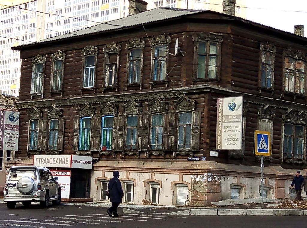 I. Градостроительные характеристики:1.1. Местоположение. В исторической застройке, главные юго-западный и юго-восточный фасады фиксируют исторические линии застройки ул. Чкалова и 9 января.1.2. Габариты. Двухэтажный дом с цокольным этажом. Размеры в плане 16,2 х 16, 9м.II. Архитектурные и конструктивные характеристики:II. 1. Объемно-пространственная композиция. Двухэтажный деревянный дом с цокольным этажом под вальмовой кровлей. В прямоугольный план дома вписана открытая Г-образная веранда в двух уровнях, с лестницей и П-образный в плане основной объем. В восточном крыле выгорожена лестничная клеть с парадным входом на юго-восточном фасаде. В северном углу - двухэтажный объем сеней. Южный угол дома скошен в уровне второго этажа.II.2. Материал стен. Бревенчатые стены рублены «в лапу». Цокольный этаж из бута и красного кирпича, оштукатурен, побелен.II.З. Элементы фасадов:II.3.1. Междуэтажный карниз. Профилированная рейка и трехрядная пропильная резьба по деревянной обшивке.II.3.2. Цокольный карниз профилированный, (юго-восточный, юго-западный, северо-западный фасады).II.З.З. Лопатки рустованные на главных фасадах. Отмечают выходы капитальных стен цоколя, выделены возвышающейся ступенью над цокольным карнизом.II.З.4. Окна цокольного этажа. Прямоугольные с лучковым завершением. П-образные наличники с замковыми элементами, объединенными цокольным карнизом. Переплеты деревянные распашные с глухой лучковой фрамугой. Ставни двухфиленчатые на северо-западном фасаде.II.3.5. Окна 1-го и 2-го этажей. Прямоугольные, с лучковым завершением. Переплеты деревянные с фрамугой, распашные, 4-х стекольные: (1-й этаж - с горизонтальным импостом в нижней трети переплета, 2-й этаж - в верхней трети переплета). Спаренные окна (2 шт.) на юго-восточном фасаде.II.3.6. Наличники 2-го этажа. Лобань в виде разорванного фронтона с профилированным карнизом с сухариками. Поле лобани заполнено обработанными рельефной резьбой накладками в виде гирлянды с фестонами, над стойками - накладки в виде бриллиантового руста, 8 - образные пропильные «уши» по бокам. Фронтон увенчан точеными маковками в среднем разрыве и над стойками, по скатам 8 - образные пропильные элементы. Стойки наличника с накладками в виде полуколонок и с криволинейными пропильными свесами. Фартук симметричный с профилированным карнизом над узкими накладками и бриллиантовым рустом по свесам, с пропильными 8 - образными элементами и кругом с рельефным радиальным узором между ними.II.3.7. Наличники 1-го этажа. Лобань в форме треугольника с плечиками, образована вертикальными пластинами с полосой подзора над проемом по контуру. Фланкирована накладками в виде бриллиантового руста в профилированной рамке, со свесами в виде ряда прямоугольных и ряда треугольных зубцов. Плоскость лобани разделена профилированной рейкой, раскрепованной на флангах, декорирована симметричной пропильной на-кладкой и криволинейными «ушами» на боковых гранях. Профилированный венчающий карниз с подзором увенчан симметричным пропильным кокошником и маковками над плечиками. Ниже профилированного подоконного карниза стойки наличника с кистеобразными свесами украшены рельефными накладками в виде пирамидок. Фартук симметричного ломаного очертания с профилированной рейкой по нижнему краю. Ставни трехфиленчатые, с лучковым верхом.II.3.8.Парадный вход в пря