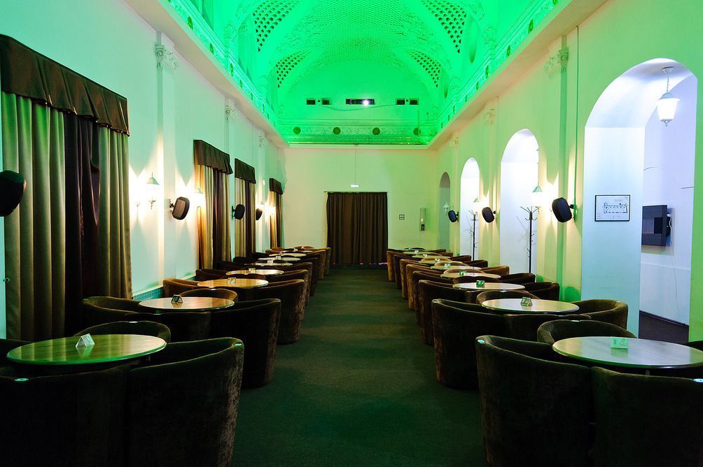 В кинозале – высокий сводчатый потолок с лепниной; кроме того, «Звезда» – это не только кинотеатр, но и кафе. Мягкие удобные кресла и круглые столики в зале, где обслуживает официант, обеспечивают комфортный и приятный просмотр, а атмосфера располагает к обсуждению фильмов.