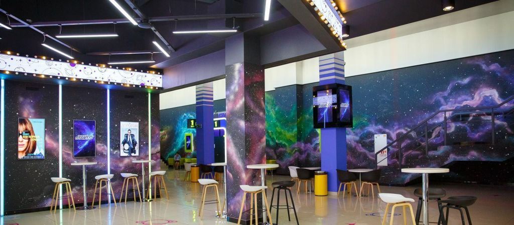 В кинотеатре действуют кино-кафе, бар самообслуживания, зона игровых автоматов.