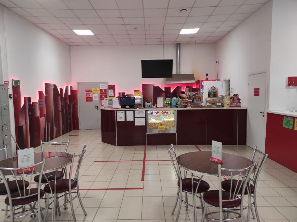 На территории кинотеатра работает кинобар, в котором можно приобрести прохладительные напитки и попкорн.