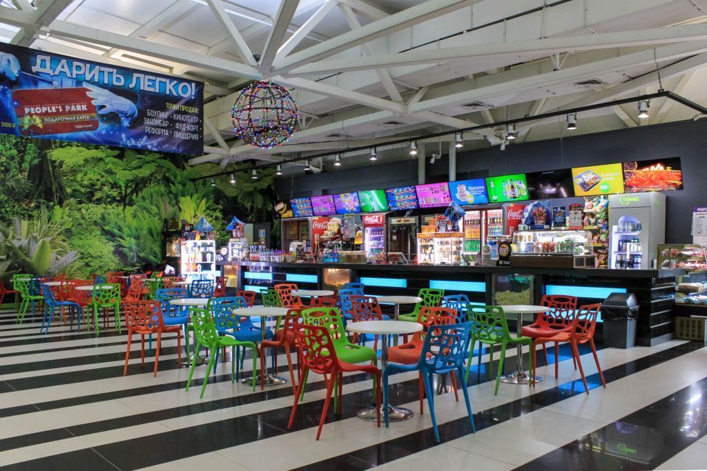 В зоне кинотеатра работает консешн-бар с разнообразным меню, установлены игровые симуляторы и батут.