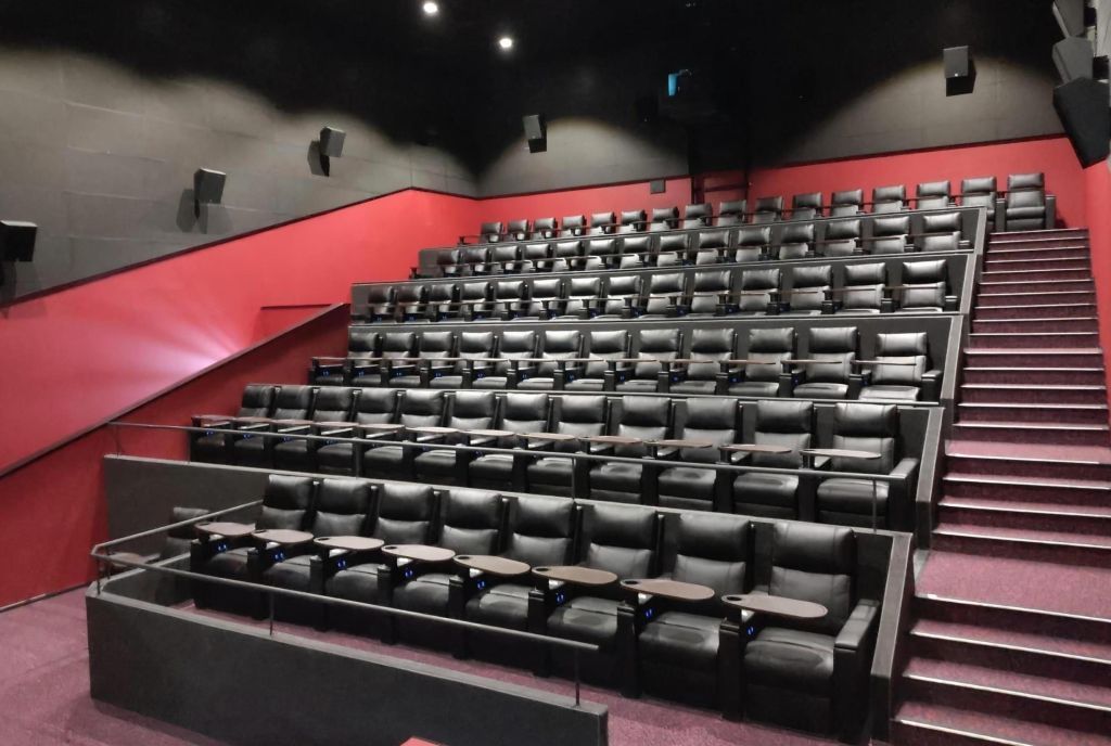 Главная особенность нового кинотеатра – это мягкие кресла-реклайнеры, которые можно привести в горизонтальное положение одним нажатием кнопки. Также все они оборудованы удобными столиками.